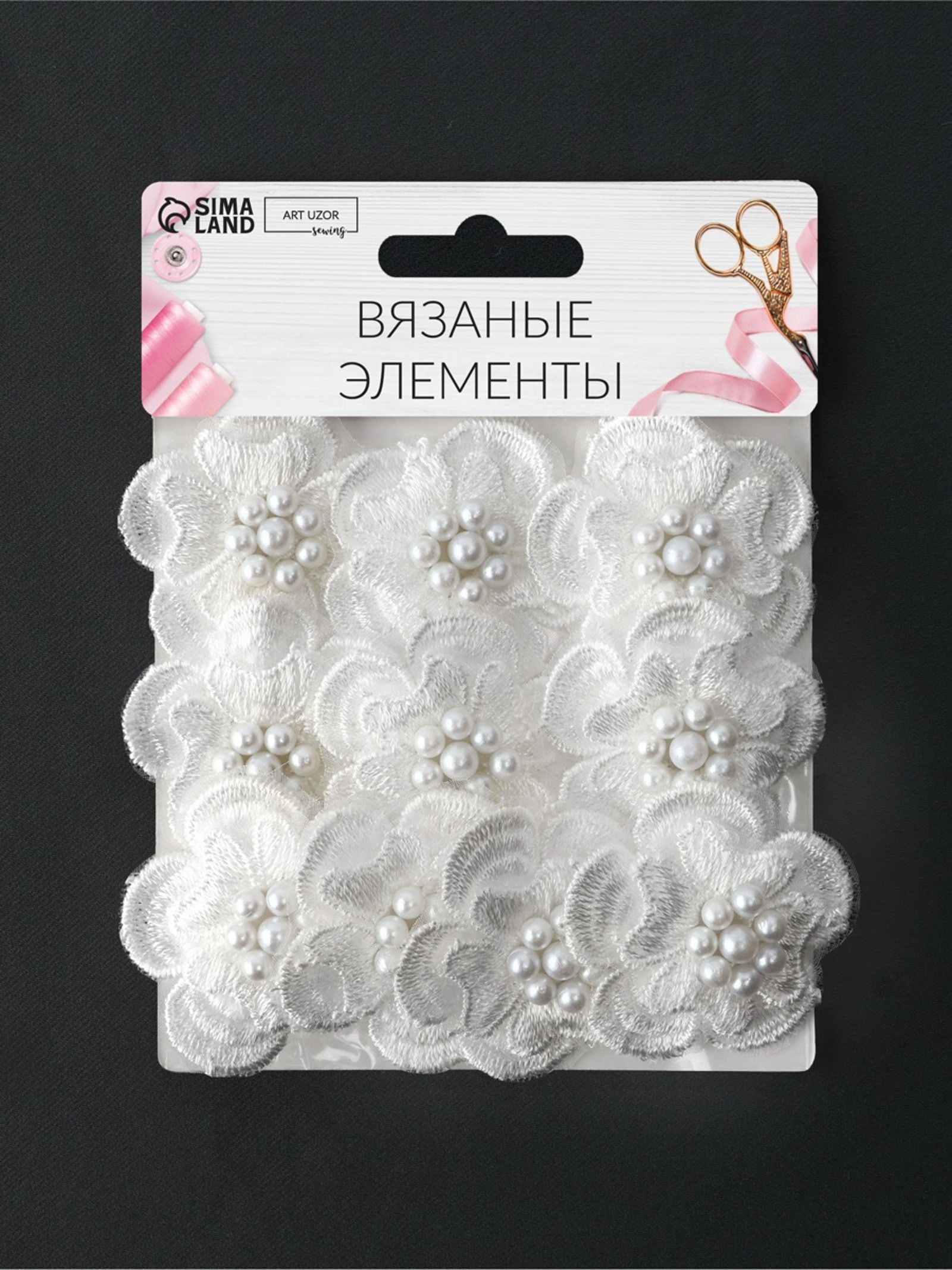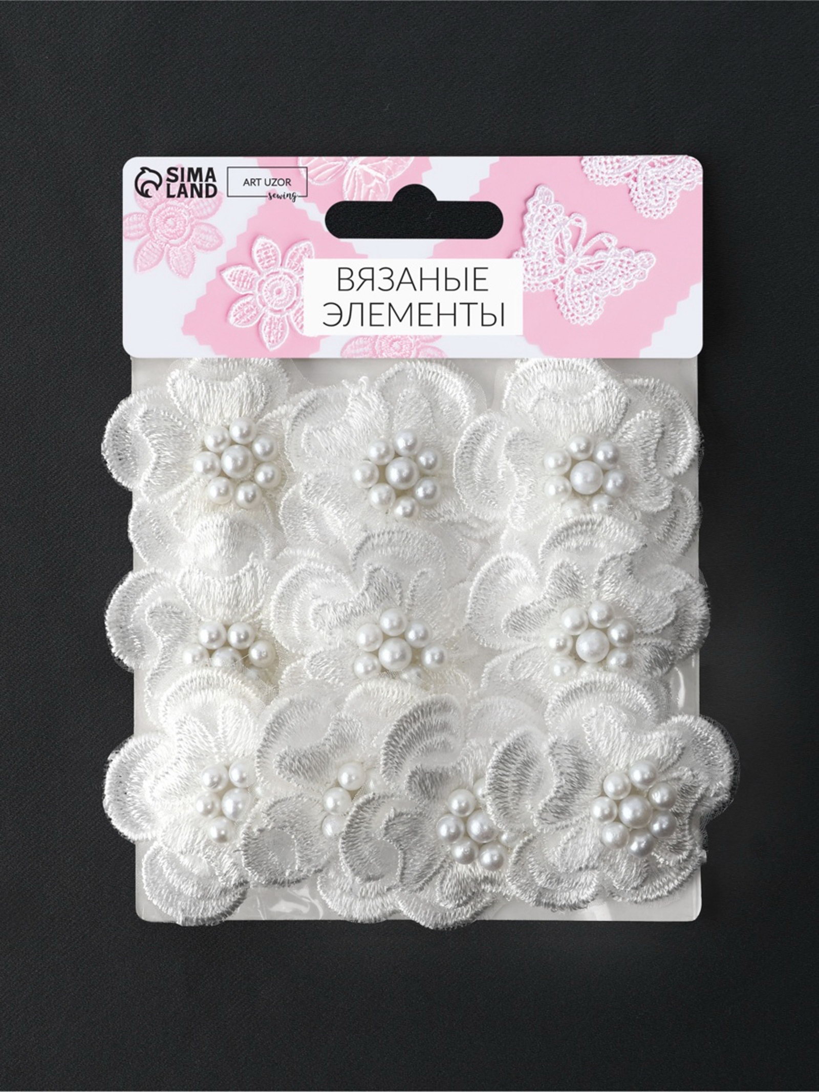 Аппликация для одежды "Цветок" текстильная, d=4.5 см, 10 шт., белая, 7x14x1 см., Арт Узор, Китай