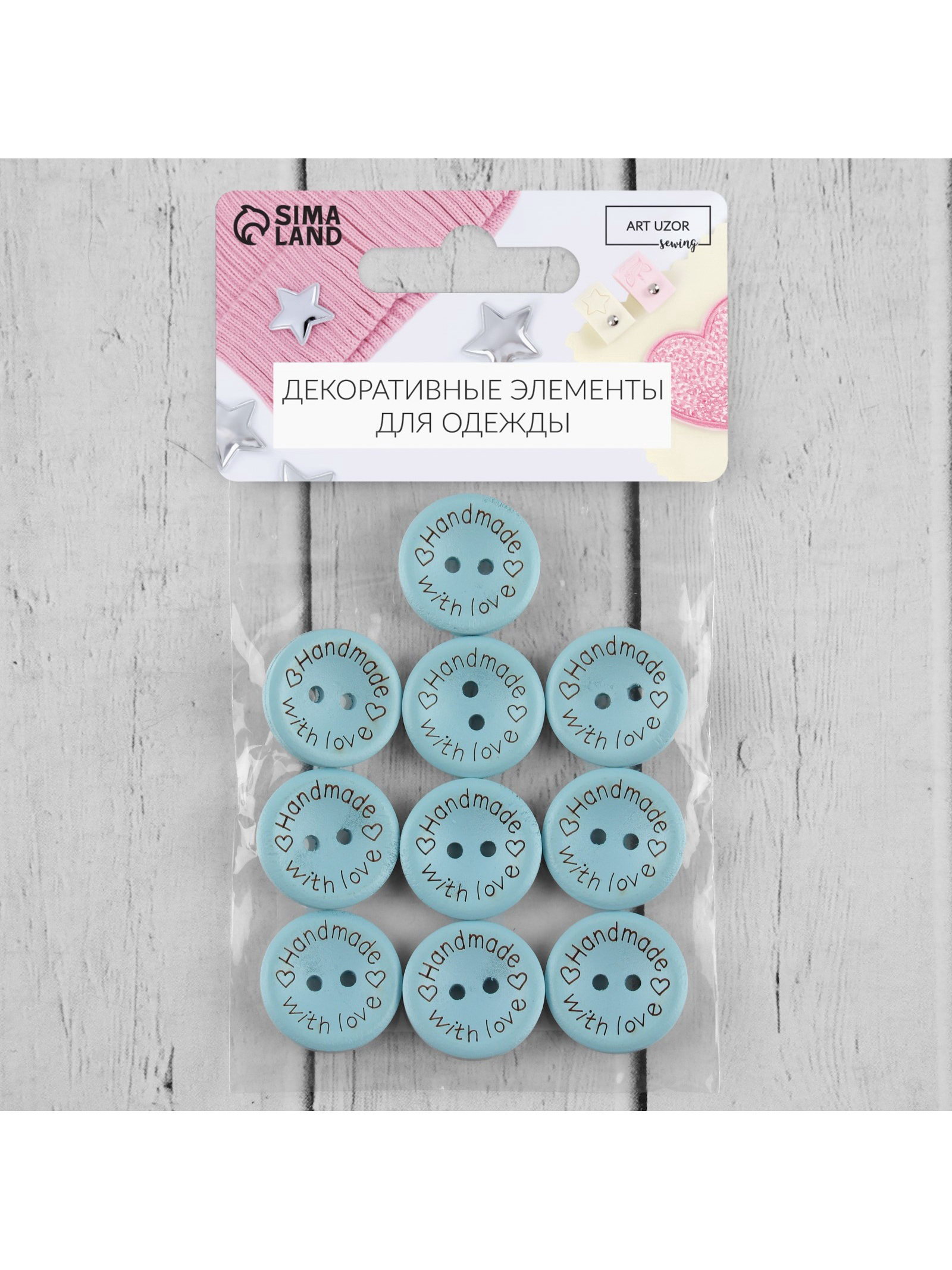 Набор нашивок из дерева Hand made with love, 2x2 см, 10 шт., голубой, 7x10x1 см., Арт Узор, Китай