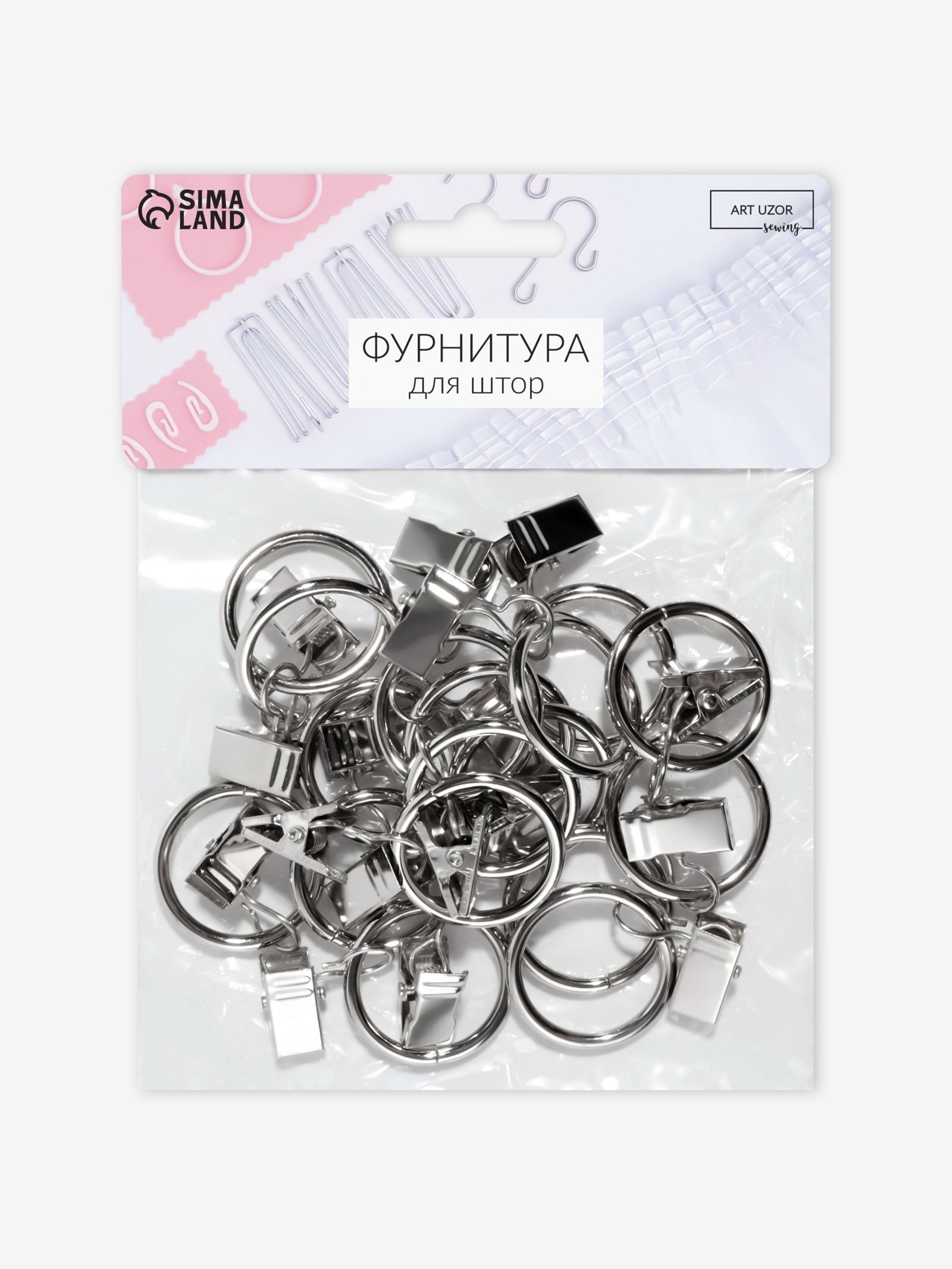 Кольцо для карниза, с зажимом, d=23/30 мм, 20 шт., цвет серебряный, 12x15x1 см., Арт Узор, Китай