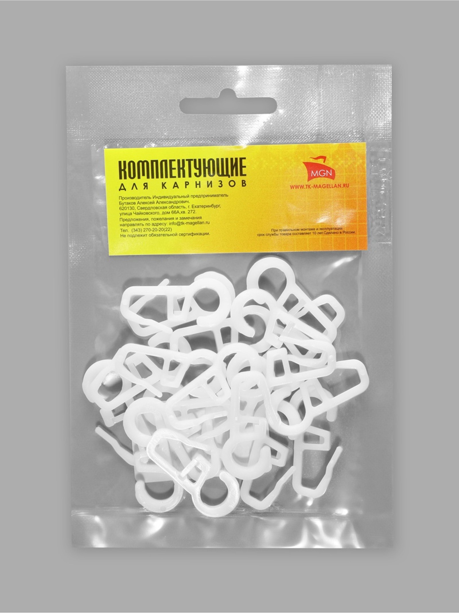 Крючок для штор на кольцо, 35x15 мм, белый, Магеллан, Россия