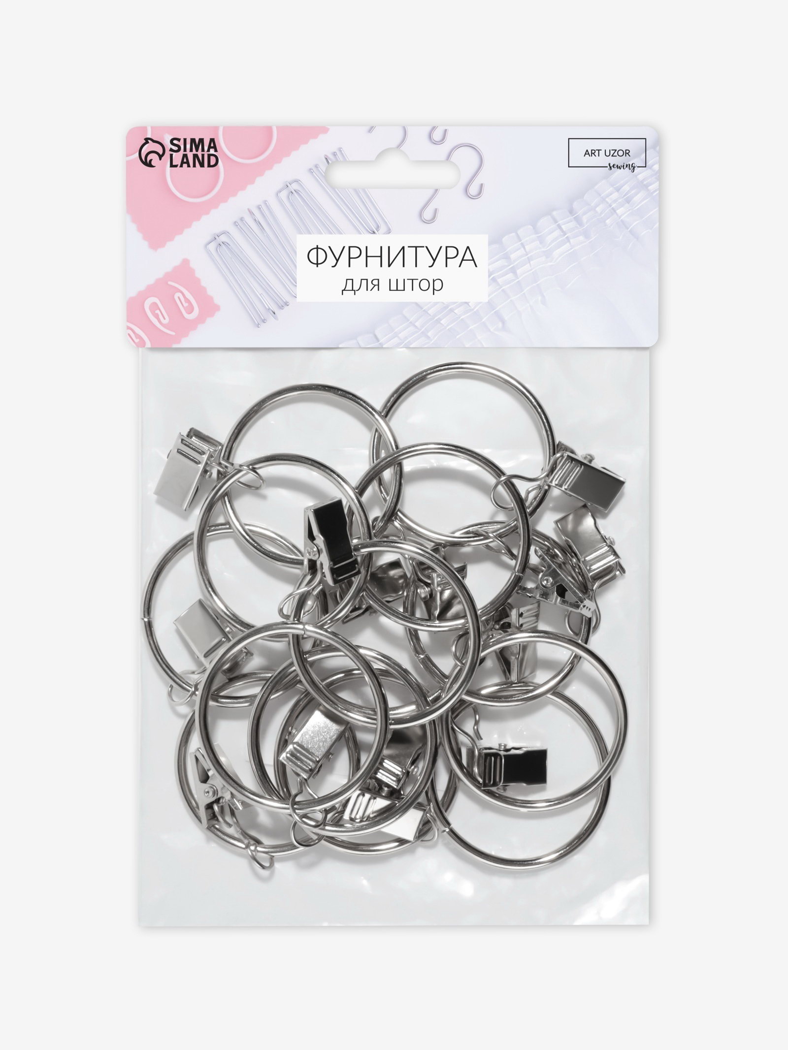 Кольцо для карниза, с зажимом, d=37/44 мм, 20 шт., цвет серебряный, 12x15x1.5 см., Арт Узор, Китай