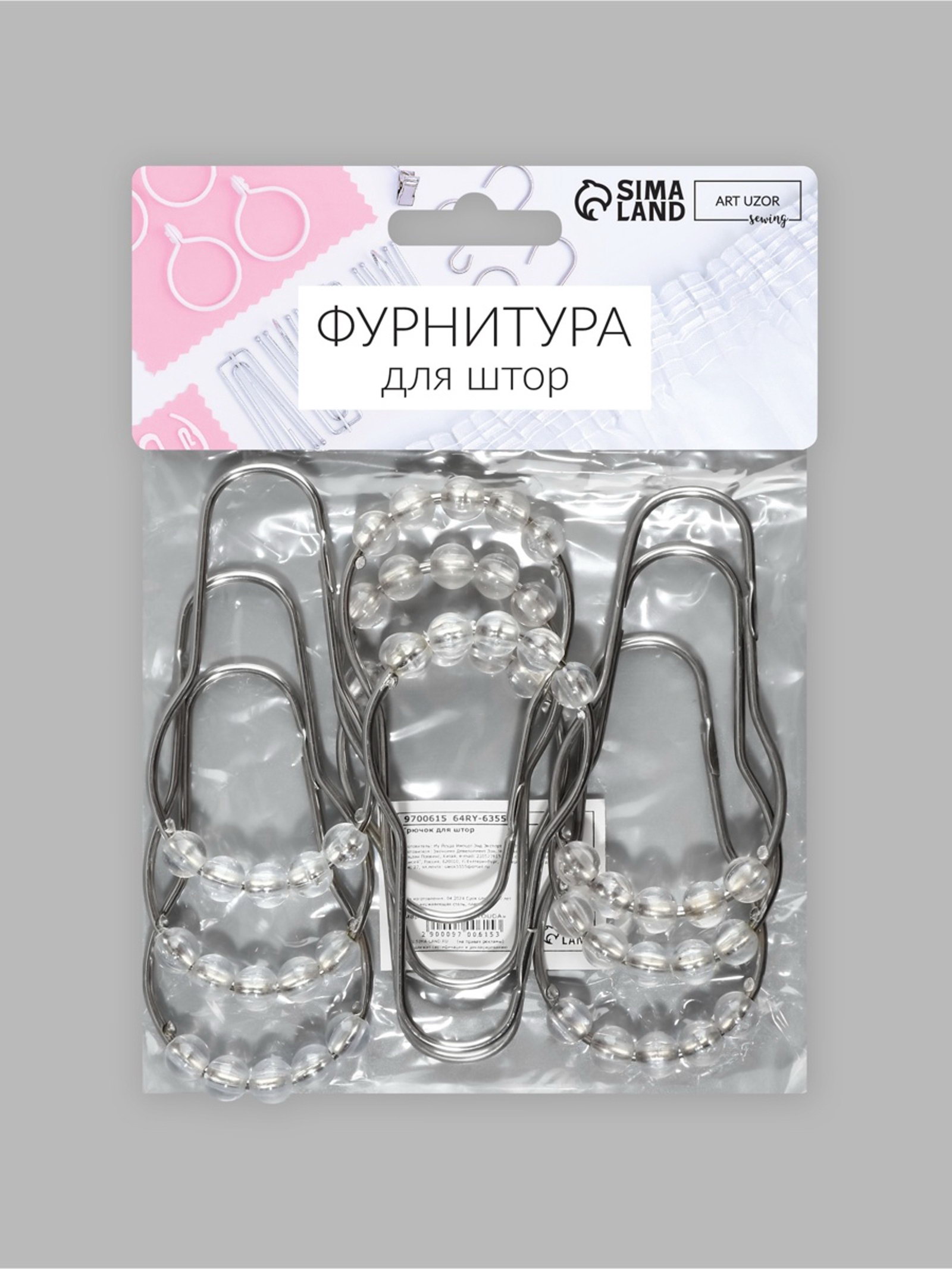 Крючок для штор с шариками, 7.5x4 см, 10 шт., цвет серебряный, прозрачный, 12x15x1 см., Арт Узор, Китай