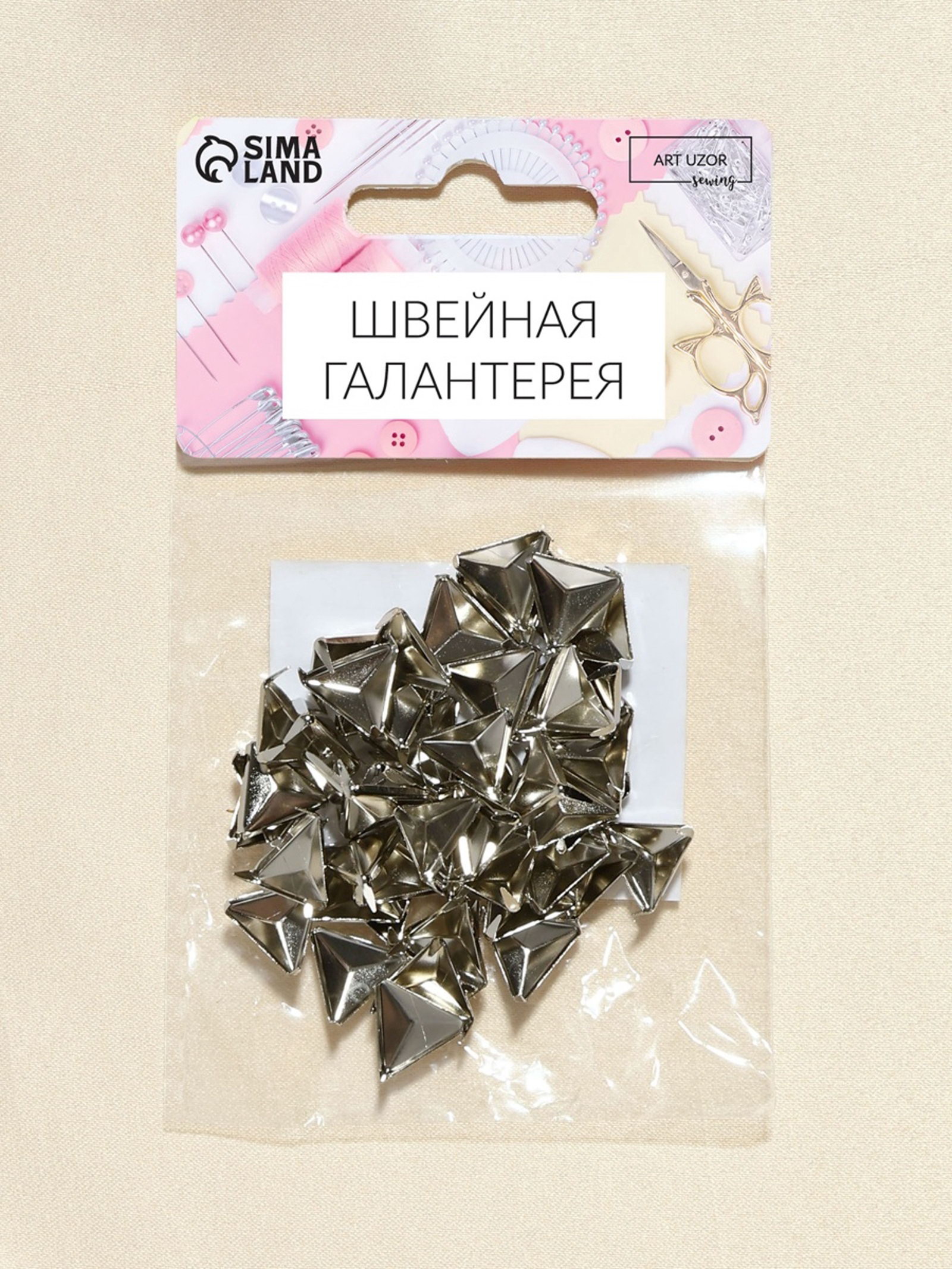 Размер упаковки: 7 x 1 x 11 см. Размер упаковки: 7 x 1 x 11 см. tnved: 8308900000 Вид декора: Декоративные украшения Цвет: Серебристый Вид: Элемент на прокол Крепление: На прокол В наборе, шт.: 50 Набор: Да Металлические треугольные штифты 12x12 мм (50 шт.) от "Арт Узор" готовые элементы для создания украшений, декора одежды. Серебристые детали с тремя креплениями подходят для украшения одежды, обуви, ремней, сумок и других изделий. Они идеально подходят для кожаных аксессуаров.
