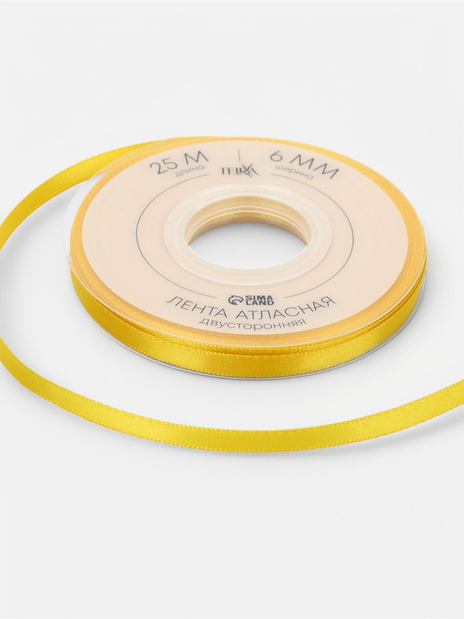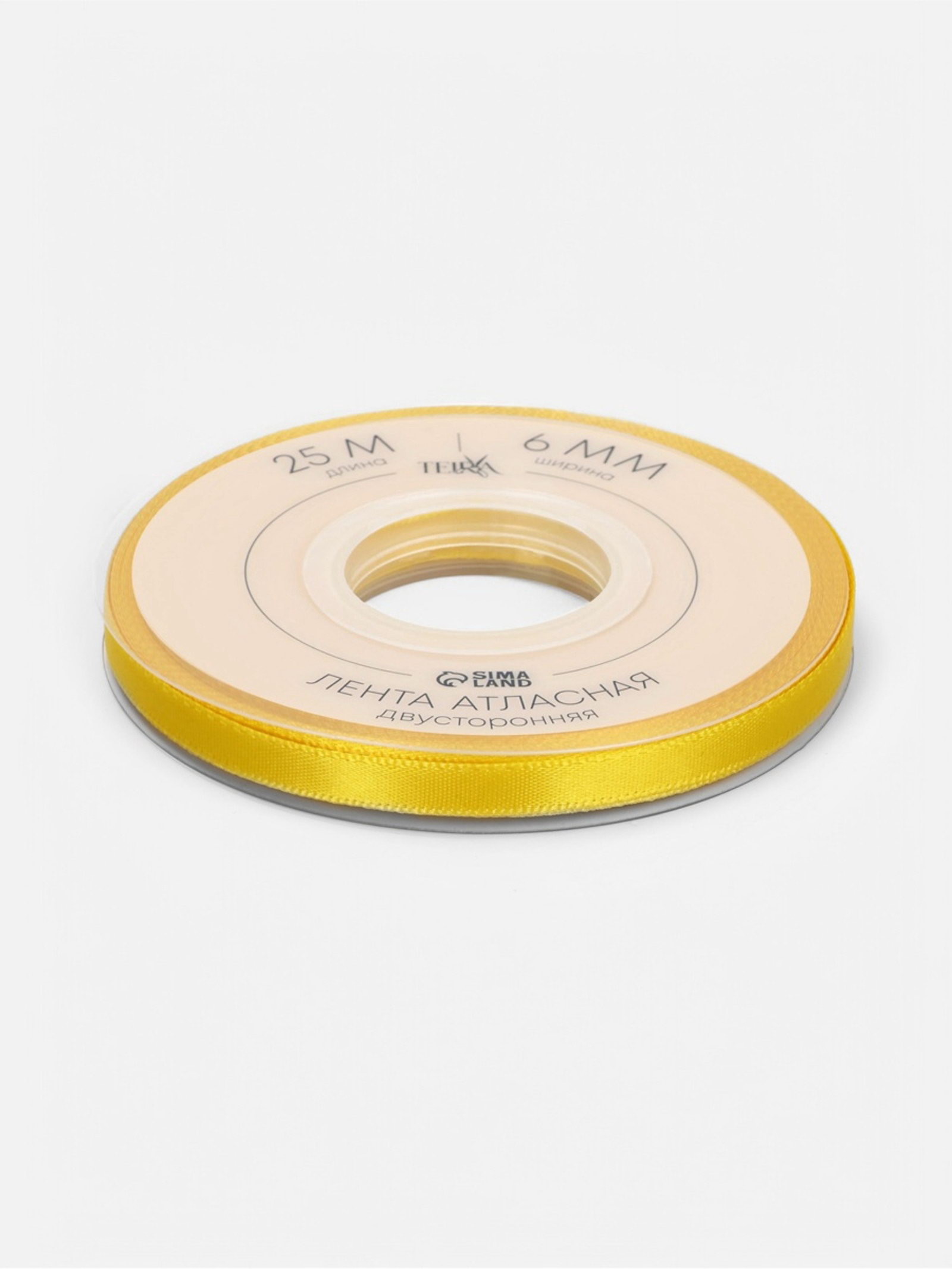 Лента атласная двухсторонняя, 6 мм, 25+-1 м, жёлтая №0645, 10x10x0.6 см., TEIRA, Китай