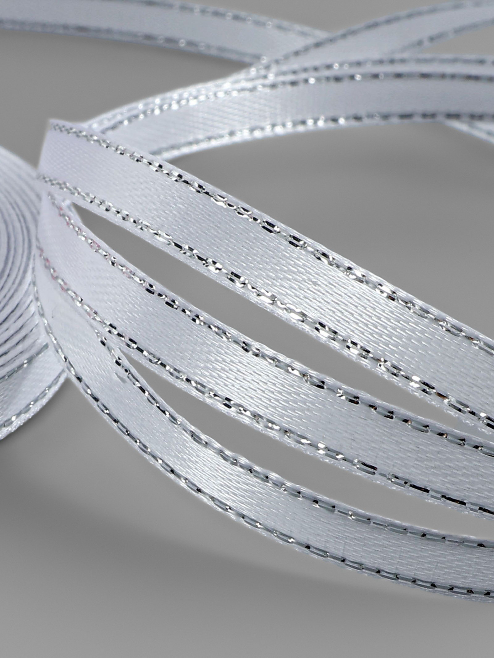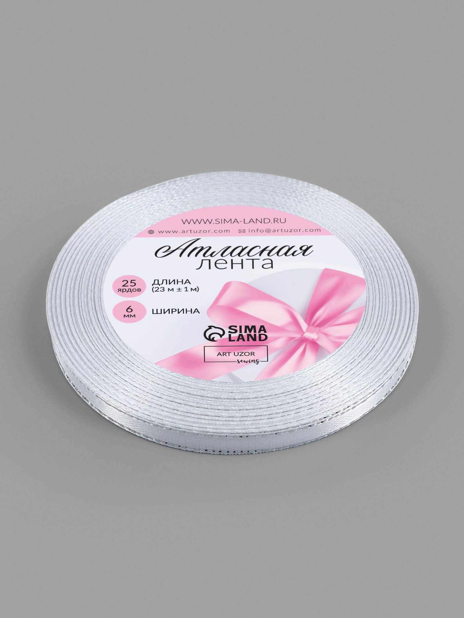 Лента атласная, с серебряным люрексом, 6 мм, 23+-1 м, белая №001, 9x9x0.6 см., Арт Узор, Китай
