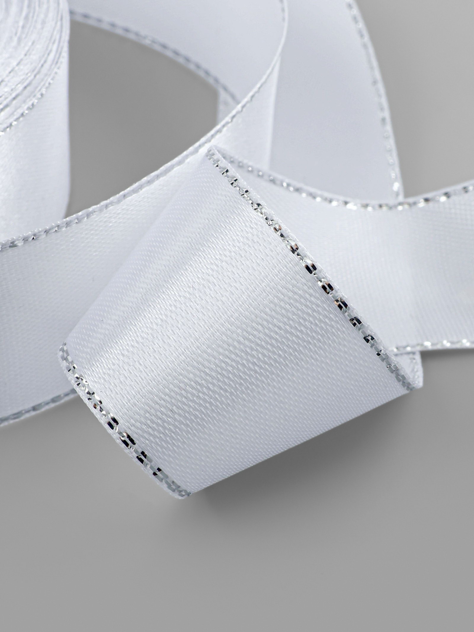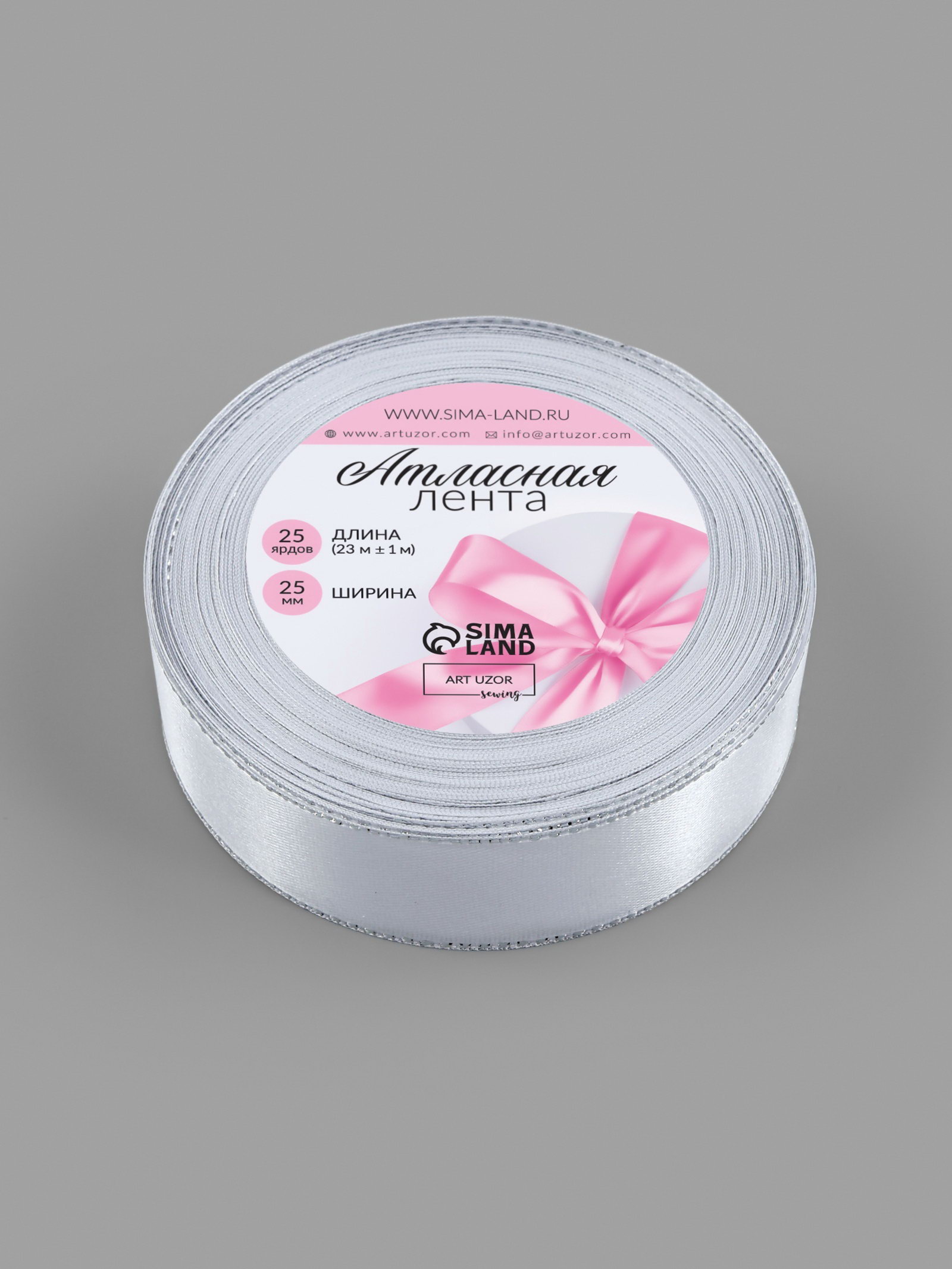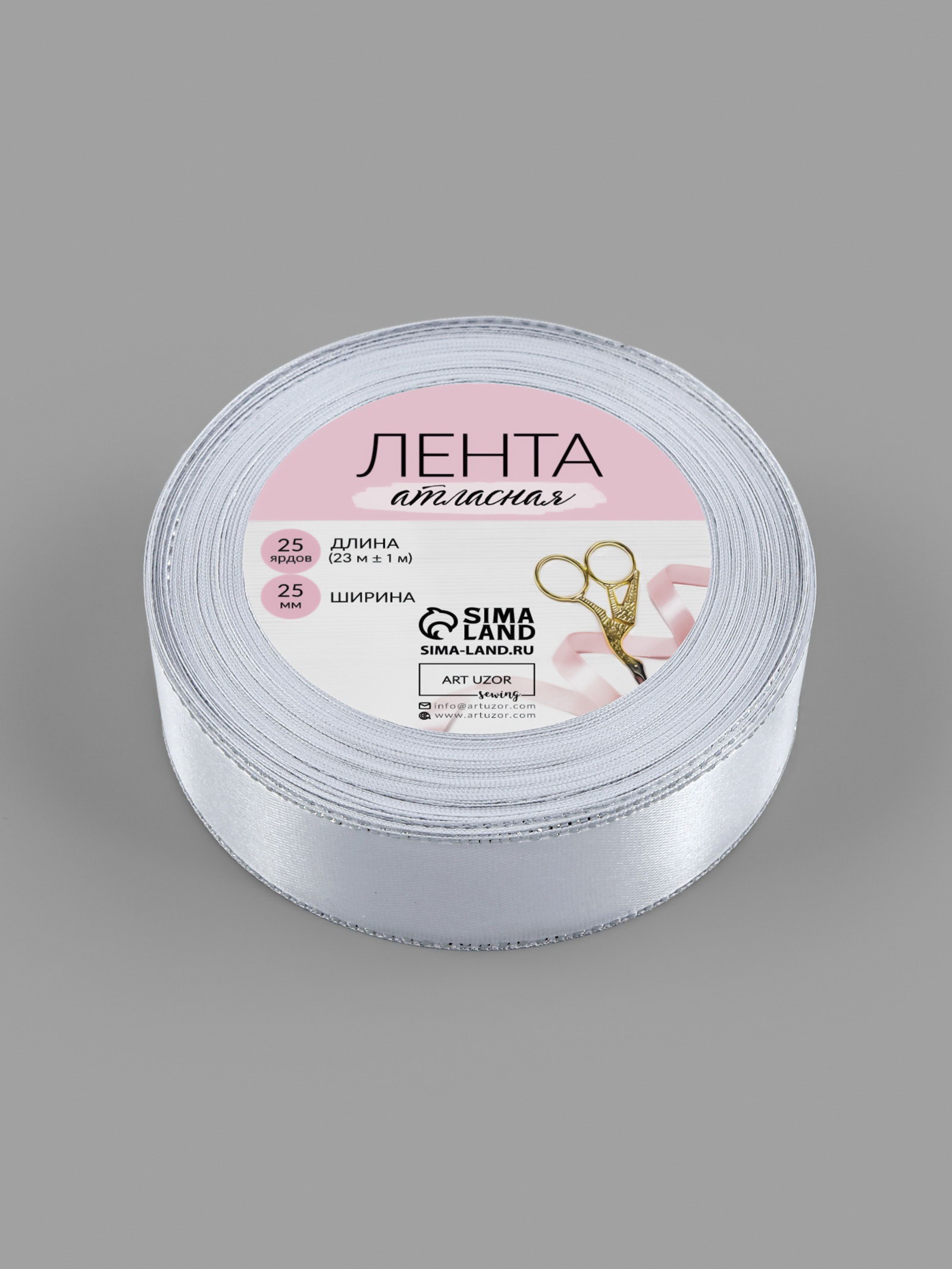 Лента атласная, с серебряным люрексом, 25 мм, 23+-1 м, белая №001, 9x9x2.5 см., Арт Узор, Китай