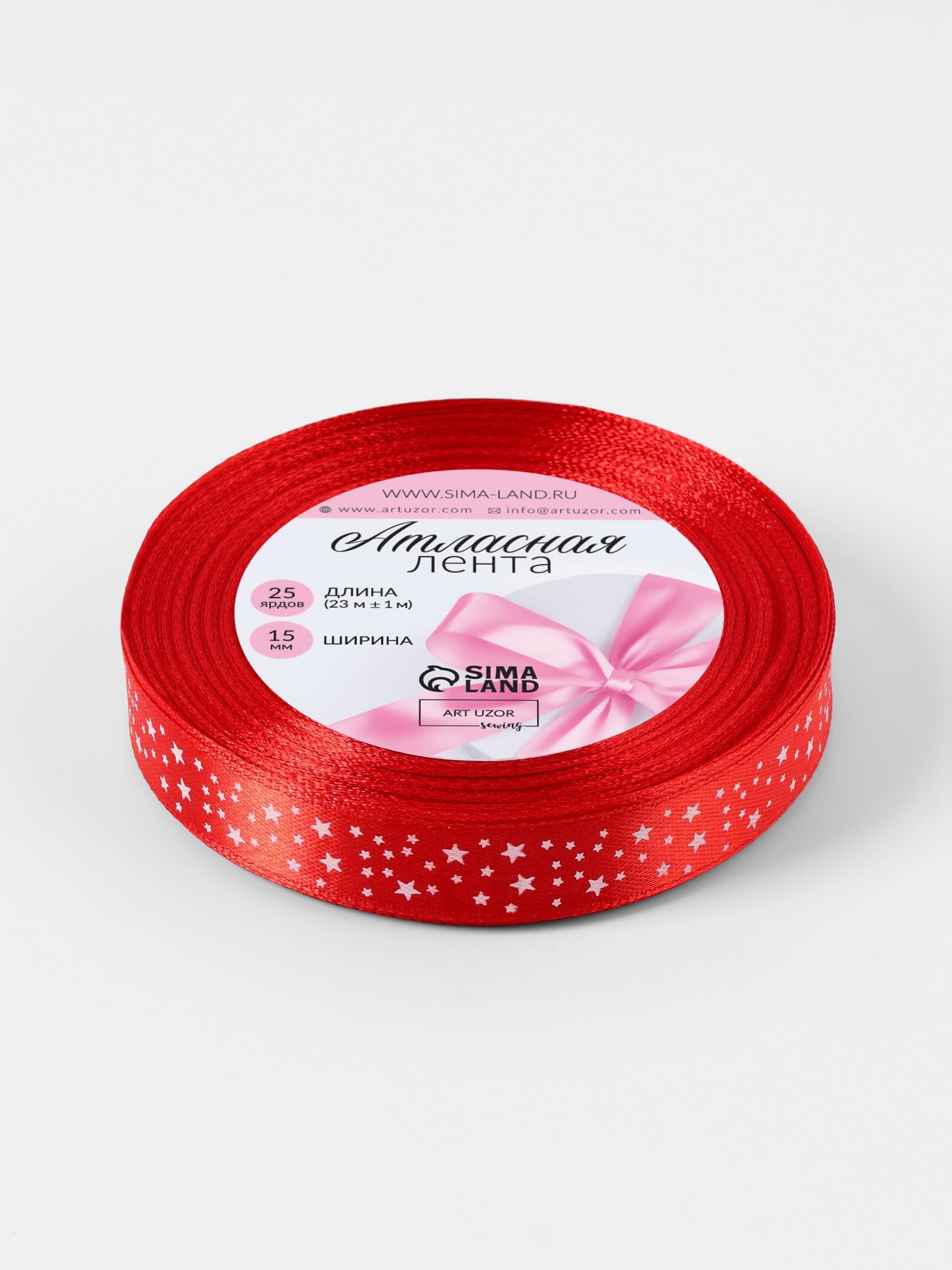 Лента атласная "Звёзды", 15 мм, 23+-1 м, красная №026, 9x9x1.5 см., Арт Узор, Китай