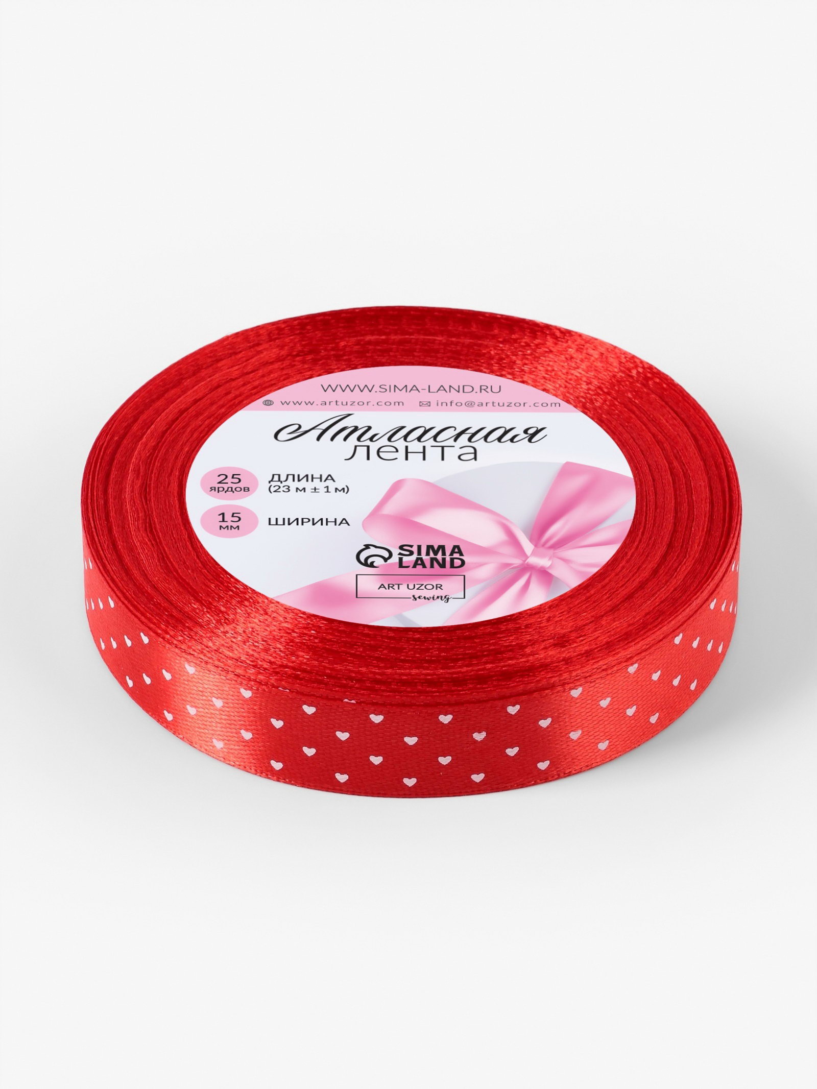 Лента атласная "Сердечки", 15 мм, 23+-1 м, красная №026, 9x9x1.5 см., Арт Узор, Китай