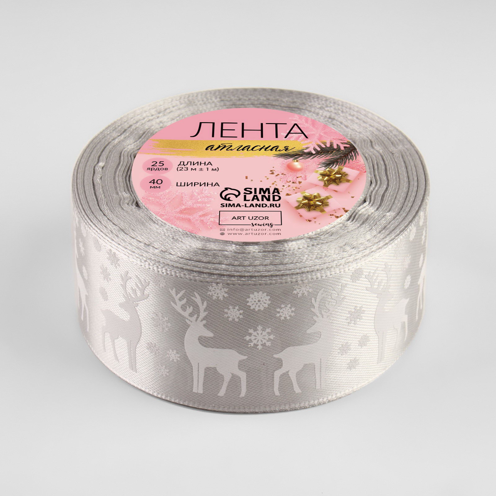 Лента атласная "Олени", 40 мм, 23+-1 м, серебряная, 9x9x4 см., Дарите Счастье, Китай
