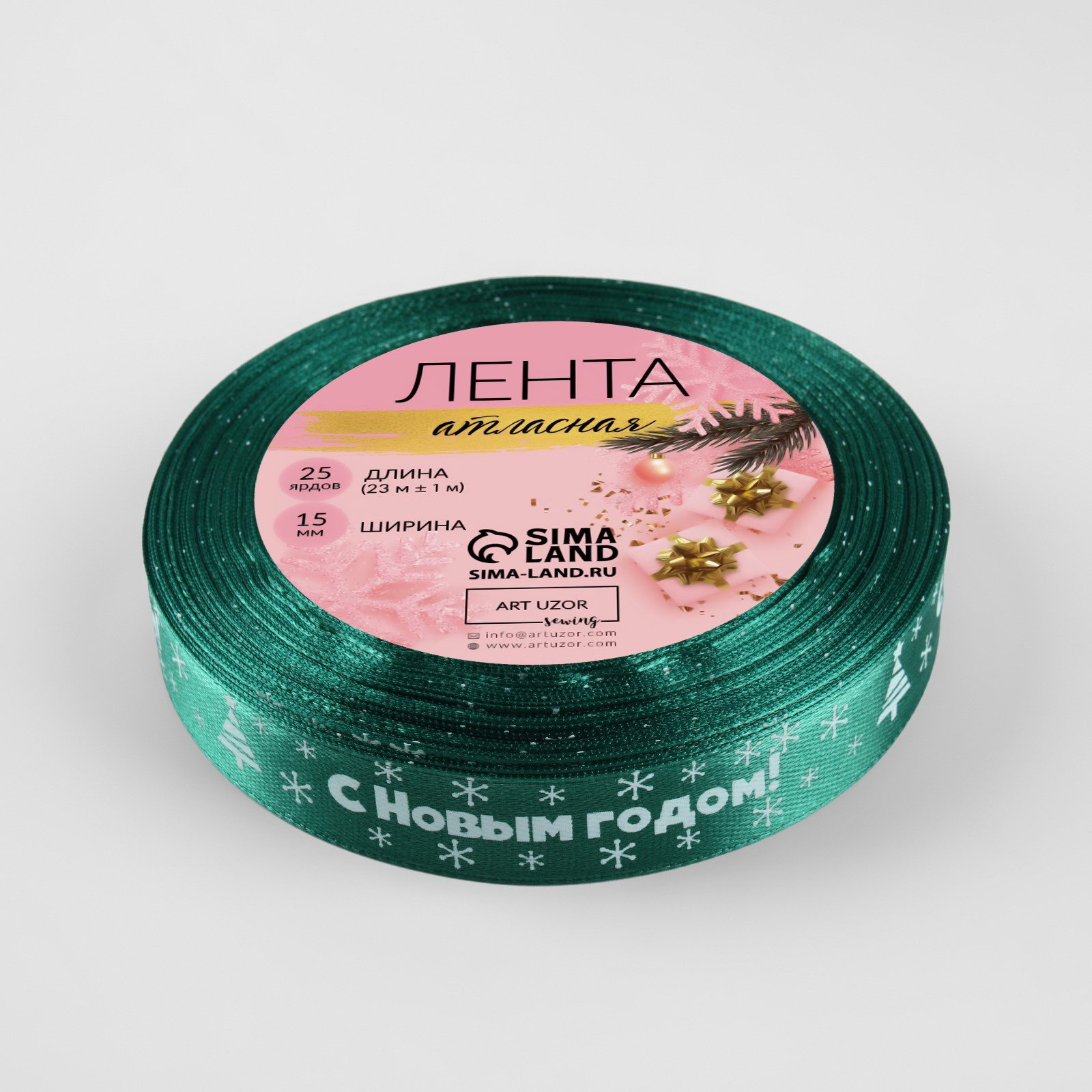 Лента атласная "С Новым годом", 15 мм, 23+-1 м, зелёная, 8x8x1.5 см., Дарите Счастье, Китай