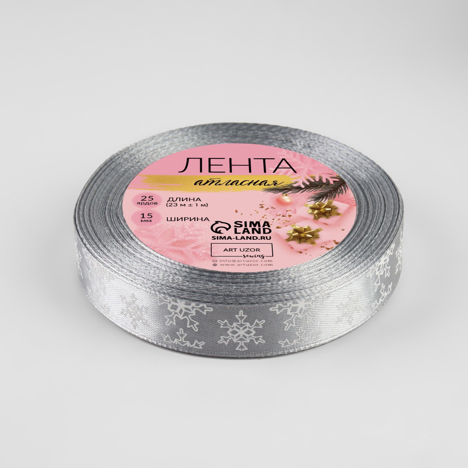 Лента атласная "Снежинки", 15 мм, 23+-1 м, серая, 9x9x1.5 см., Дарите Счастье, Китай