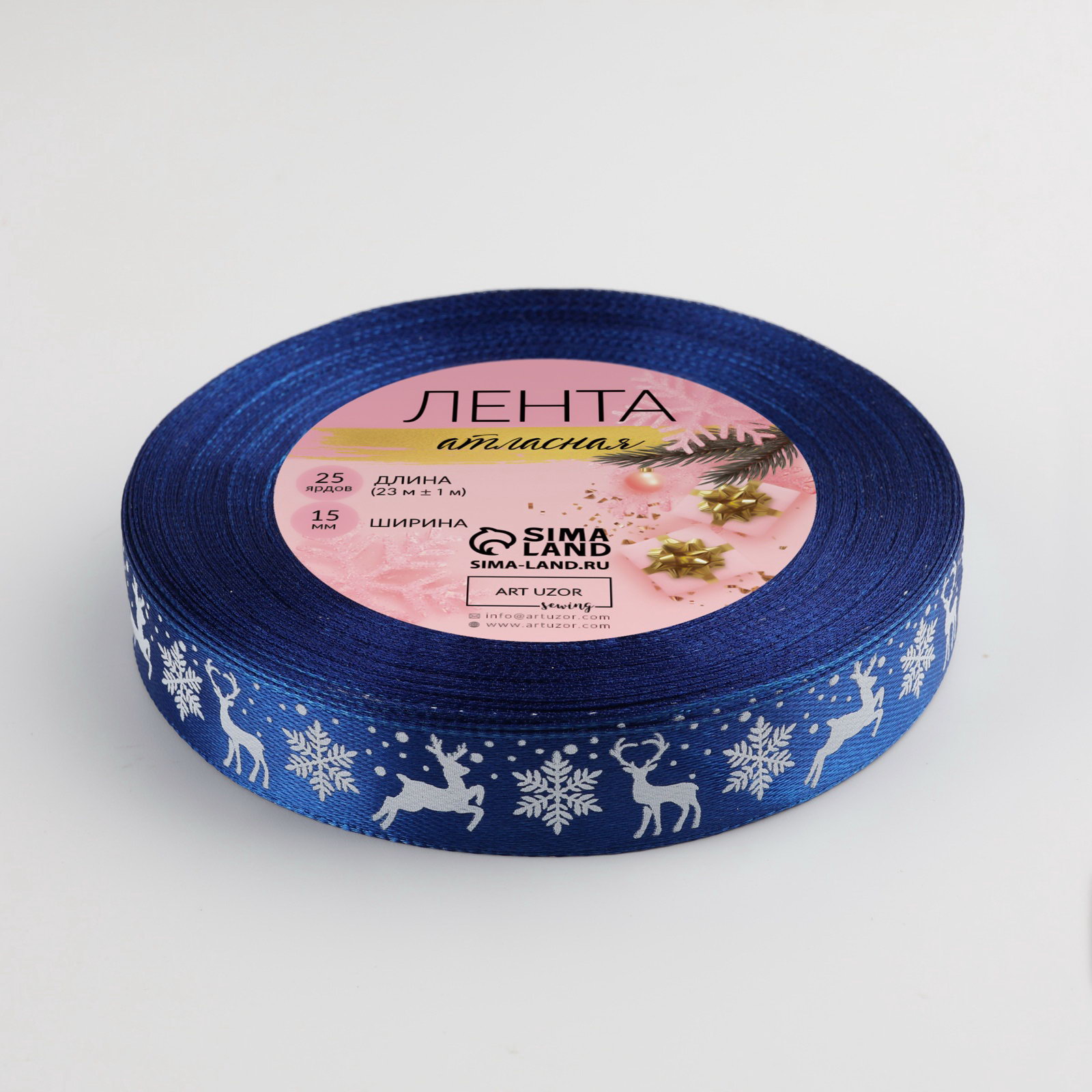 Лента атласная "Олени", 15 мм, 23+-1 м, синяя, 9x9x1.5 см., Дарите Счастье, Китай