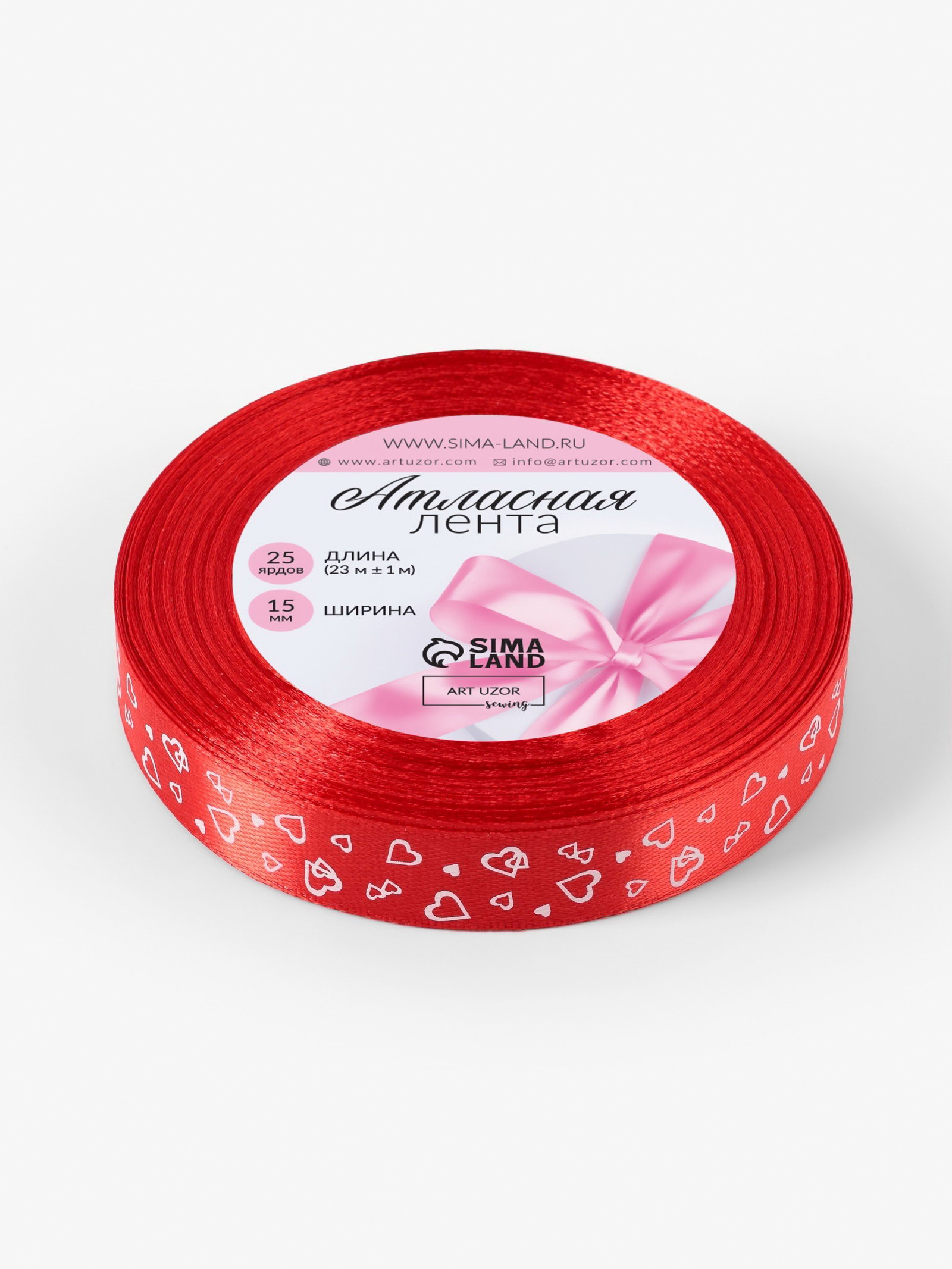 Лента атласная "Сердца", 15 мм, 23+-1 м, красная №026, 9x9x1.5 см., Арт Узор, Китай