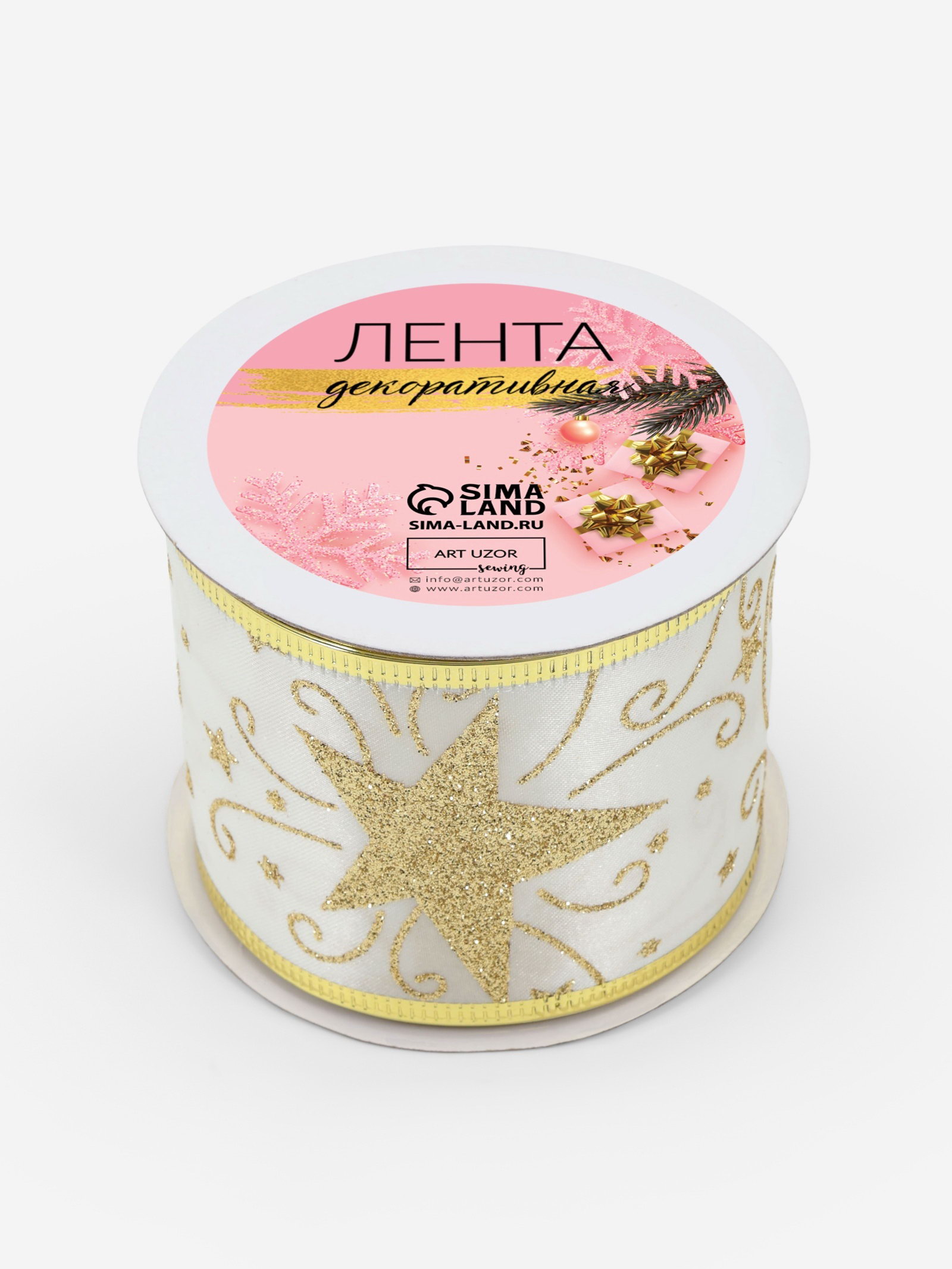 Лента атласная с металлической нитью "Узоры со звездой", 60 мм, 9+-0.5 м, цвет белый, золотой, 8x8x6 см., Арт Узор, Китай