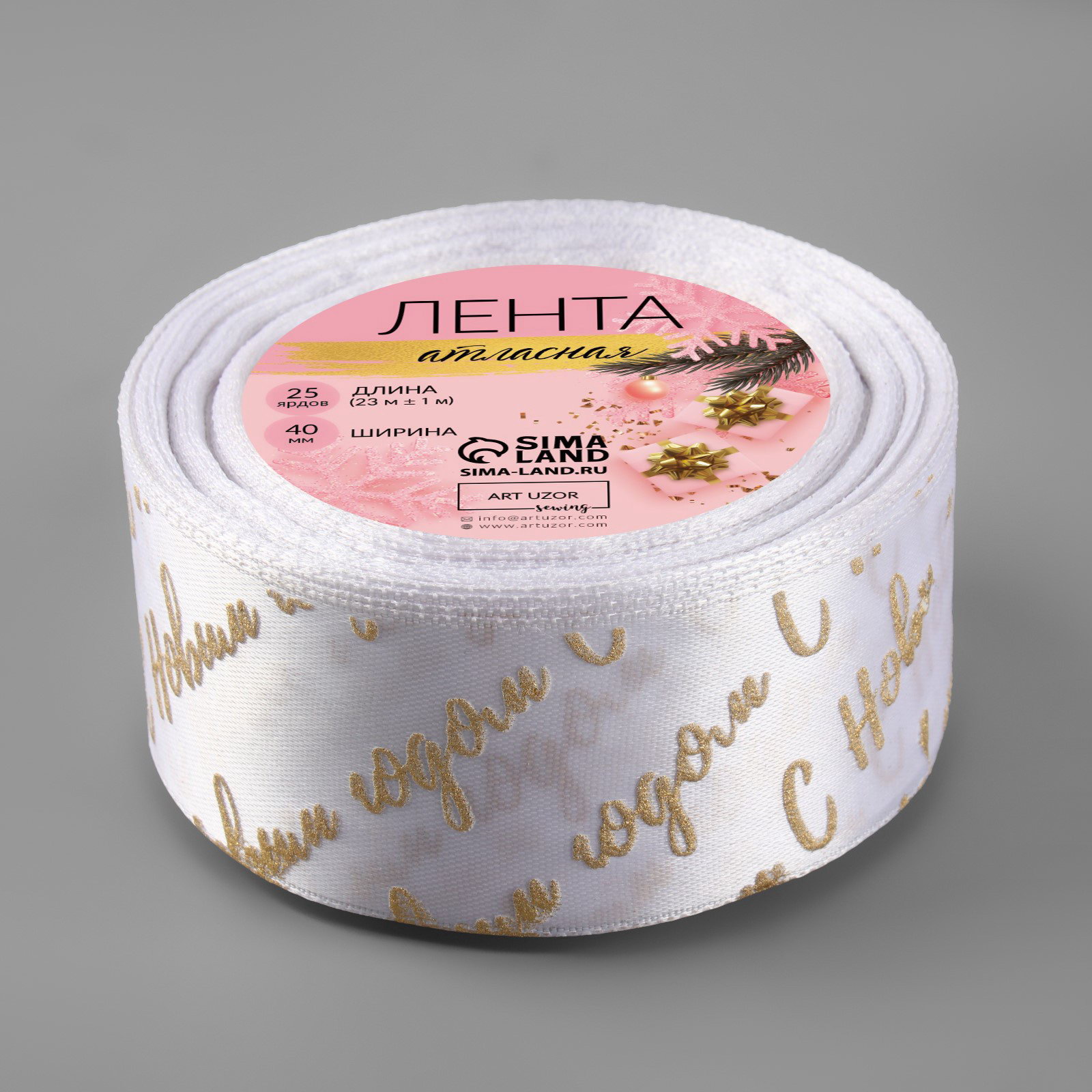 Лента атласная с тиснением "С Новым годом", 40 мм, 23+-1 м, белая, 9x9x4 см., Дарите Счастье, Китай