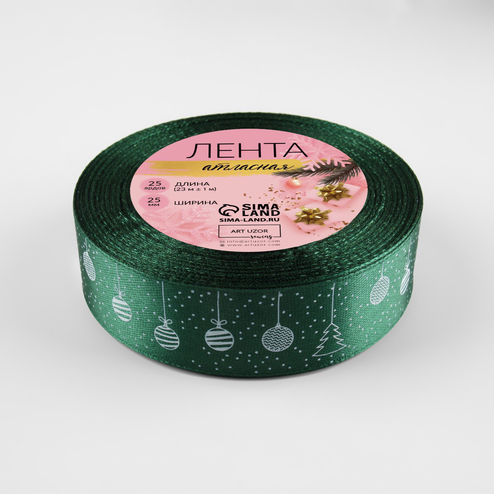 Лента атласная новогодняя "Ёлочные игрушки", 25 мм, 23+-1 м, тёмно-зелёная, 9x9x2.5 см., Дарите Счастье, Китай