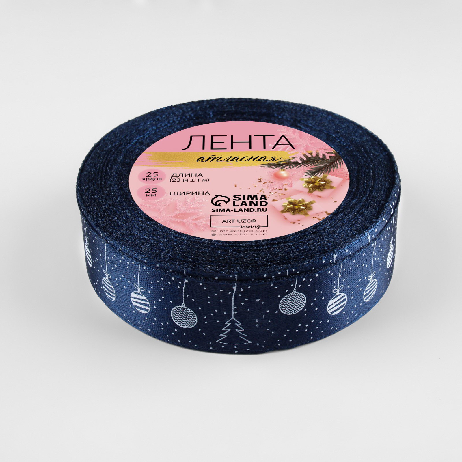 Лента атласная новогодняя "Ёлочные игрушки", 25 мм, 23+-1 м, тёмно-синяя, 9x9x2.5 см., Дарите Счастье, Китай