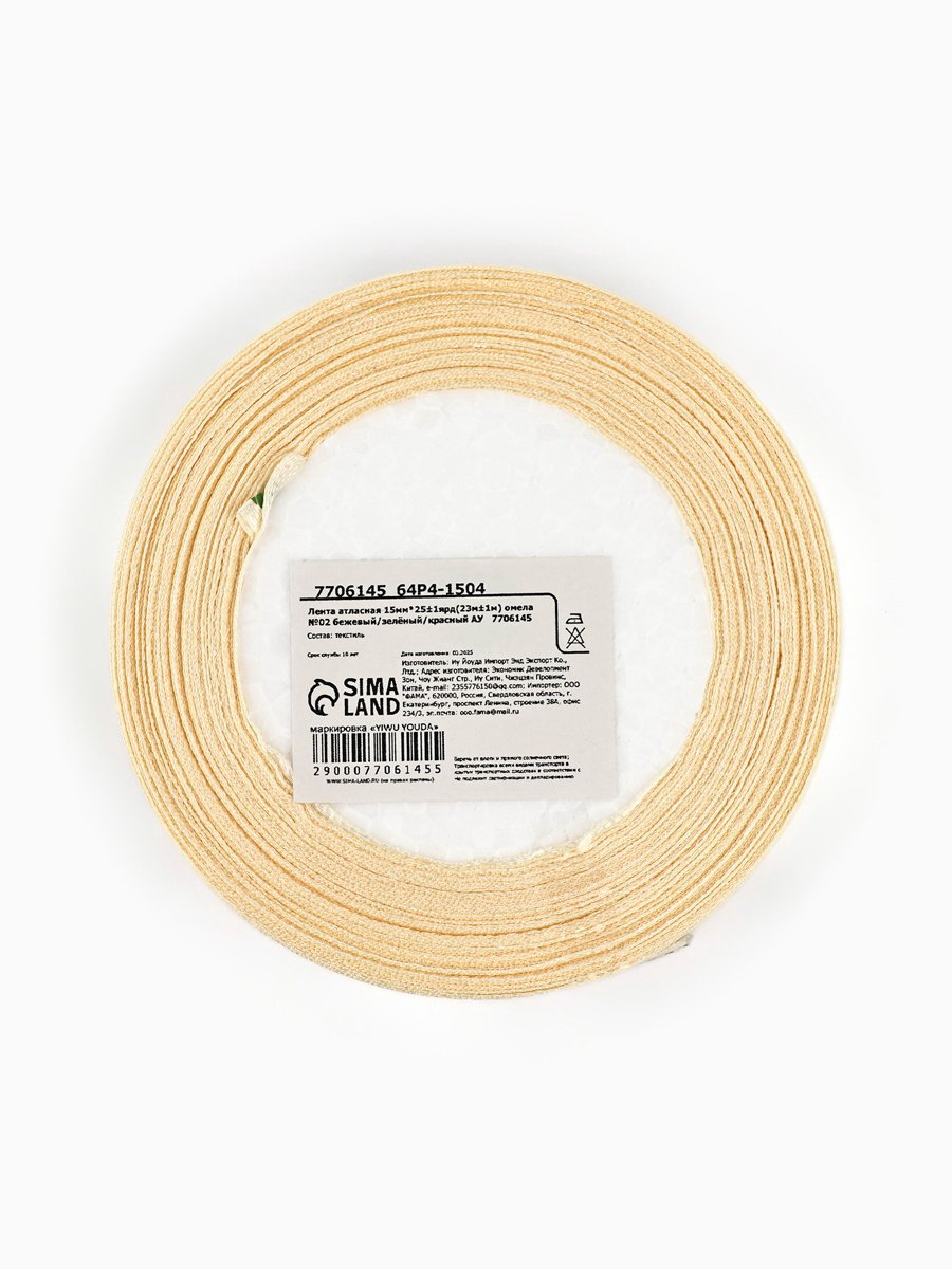Лента атласная "Омела", 15 мм, 23+-1 м, бежевая, 9x9x1.5 см., Дарите Счастье, Китай