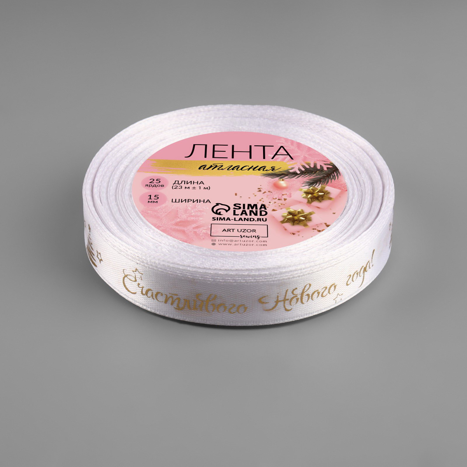Лента атласная с тиснением "Счастливого Нового года!", 15 мм, 23+-1 м, белая, 9x9x1.5 см., Дарите Счастье, Китай