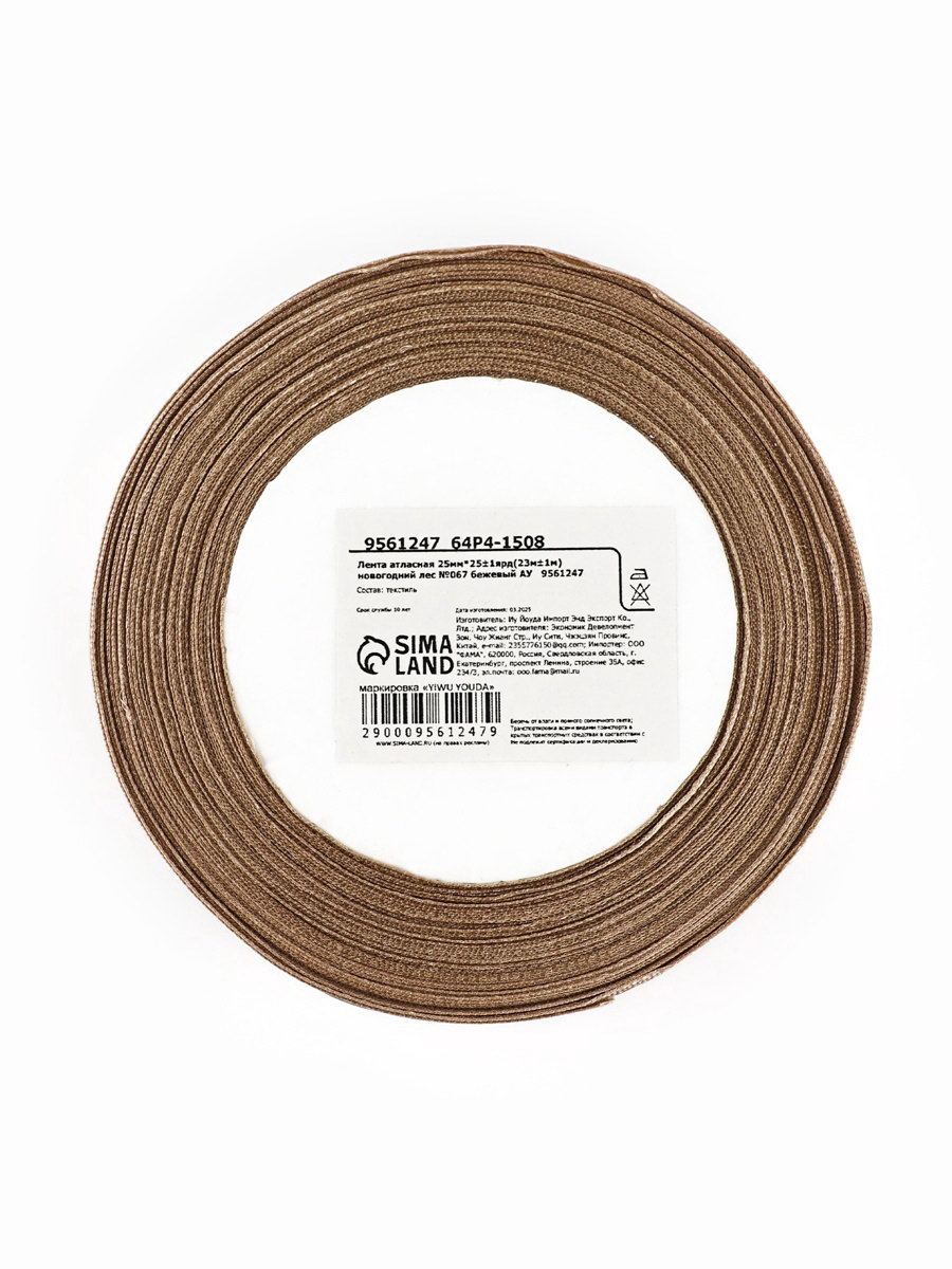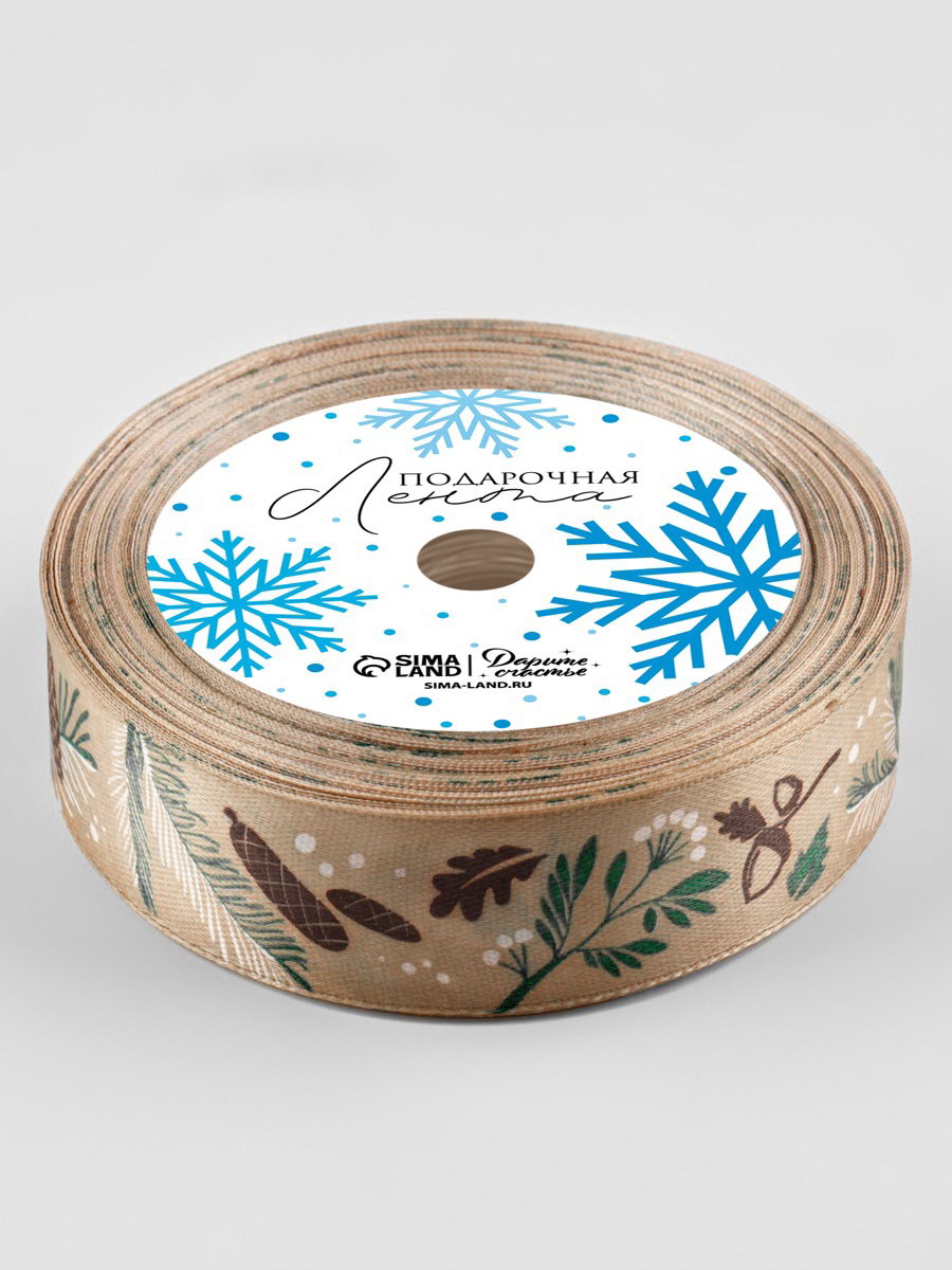Лента атласная "Новогодний лес", 25 мм, 23+-1 м, бежевая, 9x9x2.5 см., Дарите Счастье, Китай