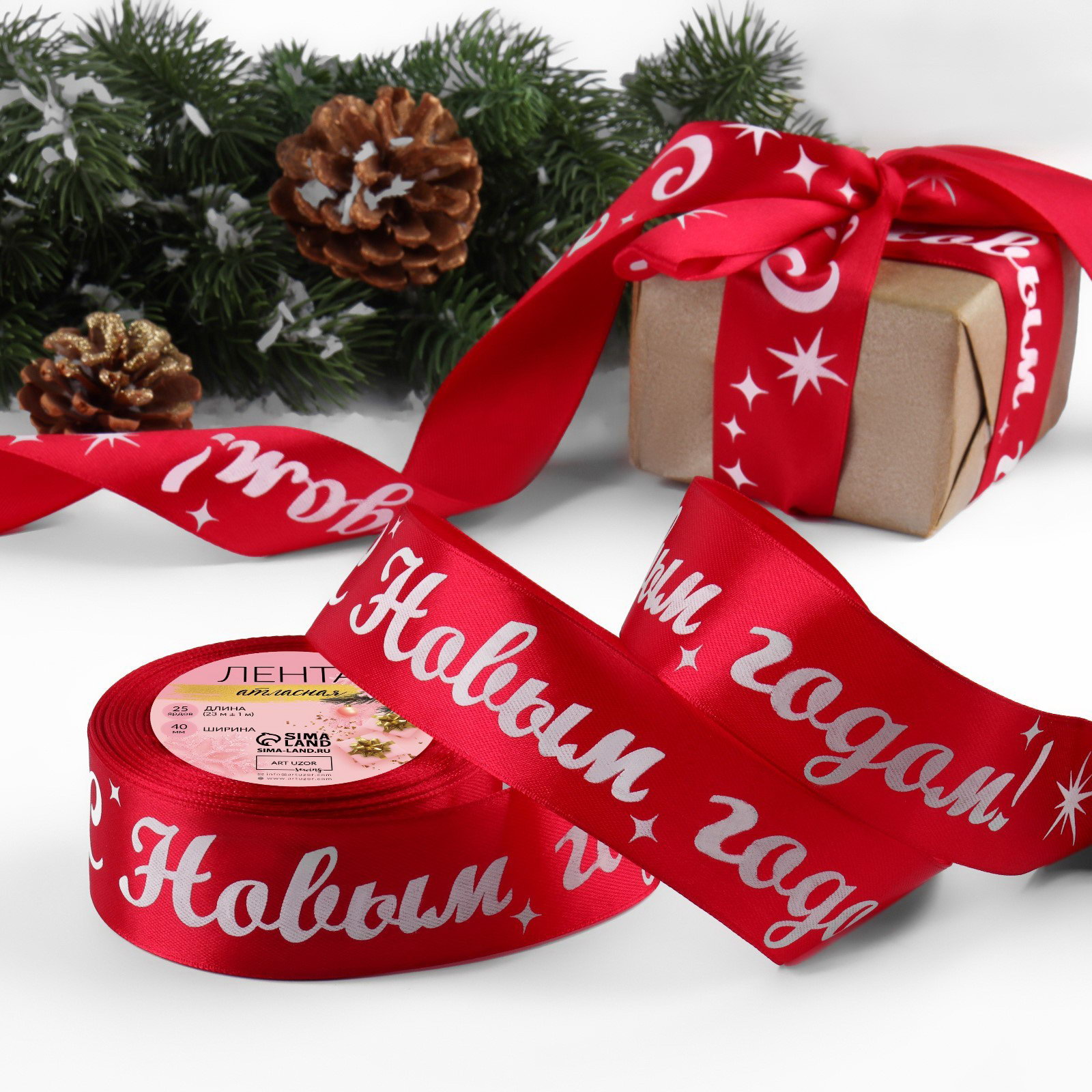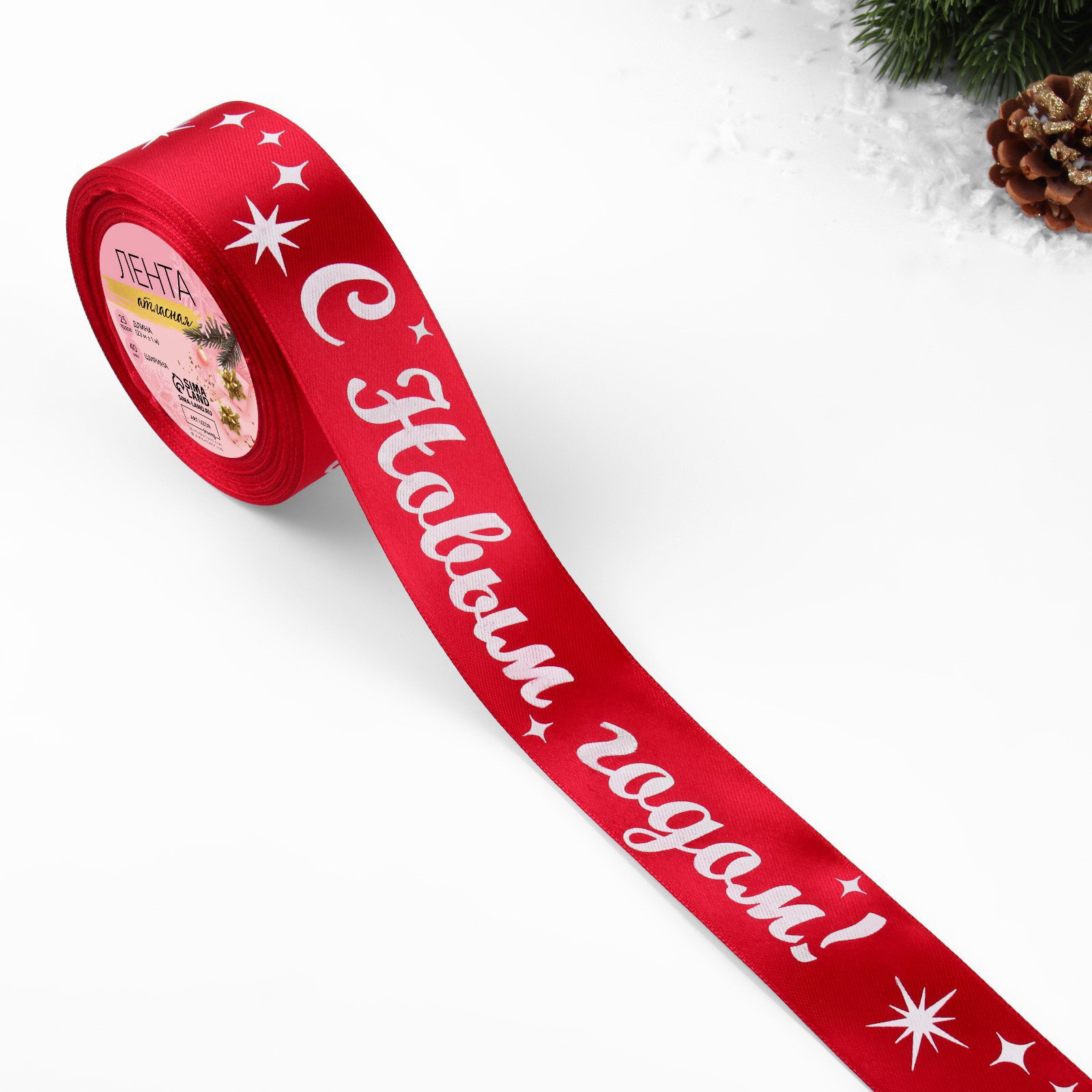 Лента атласная "С Новым годом!", 40 мм, 23+-1 м, красная, 9x9x4 см., Дарите Счастье, Китай