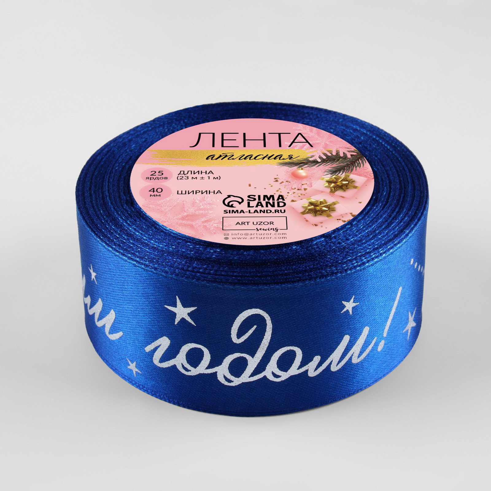 Лента атласная с тиснением "С Новым годом!", 40 мм, 23+-1 м, синяя, 9x9x4 см., Дарите Счастье, Китай