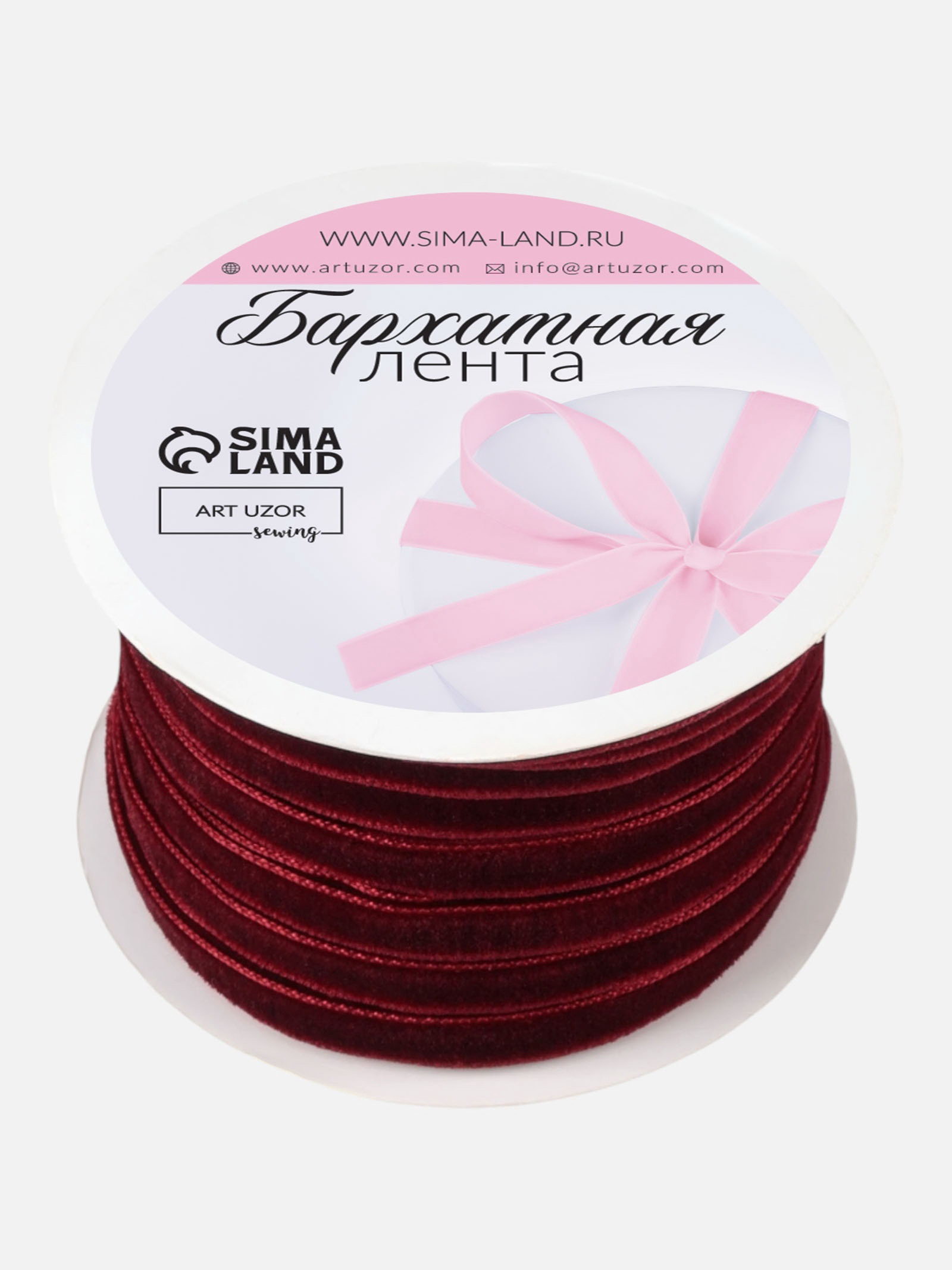 Лента бархатная, 6 мм, 18+-1 м, бордовая №43, 17x17x1 см., Арт Узор, Китай