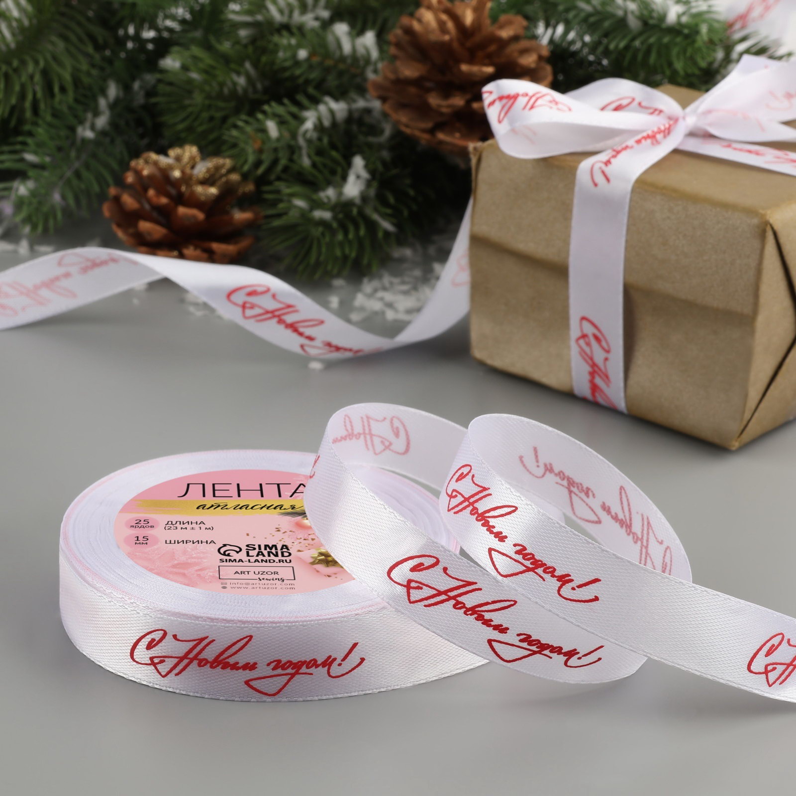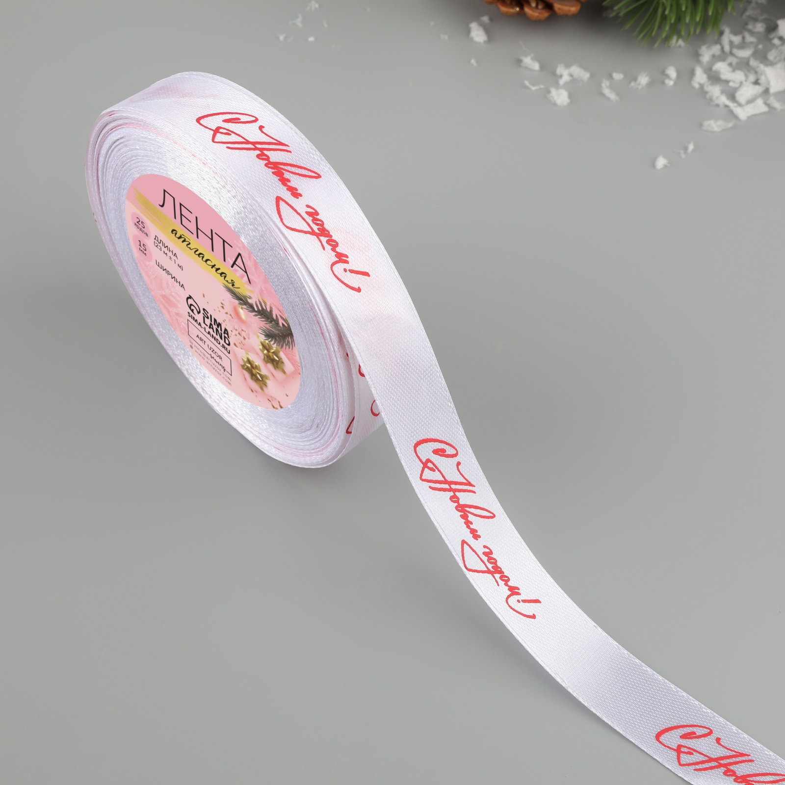 Лента атласная "С Новым годом!", 15 мм, 23 +- 1 м, цвет белый/красный №01, Арт Узор, Китай