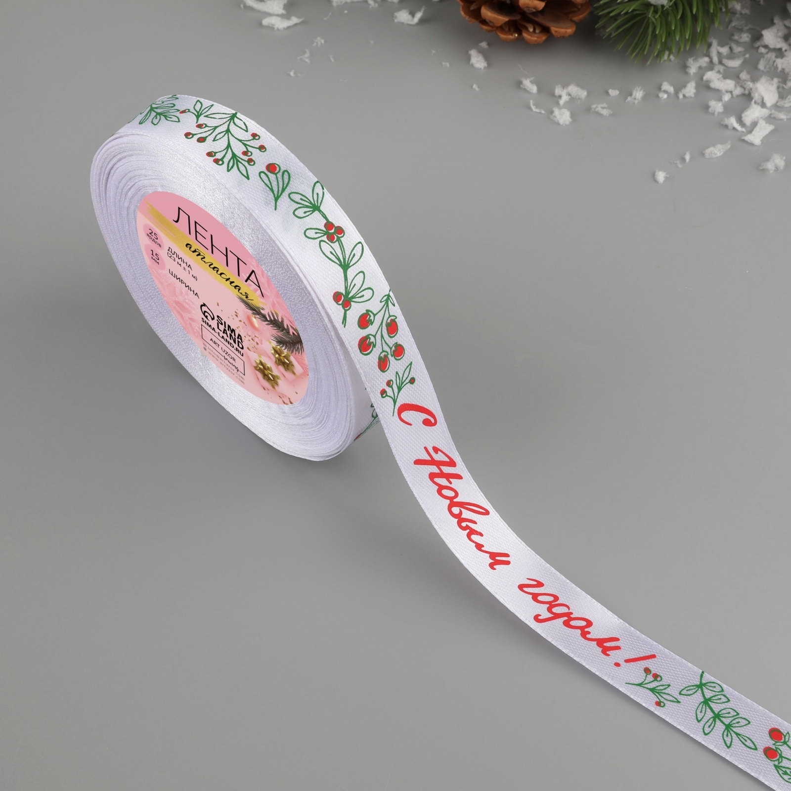 Лента атласная "С Новым годом!", 15 мм, 23 +- 1 м, цвет белый №01, Арт Узор, Китай
