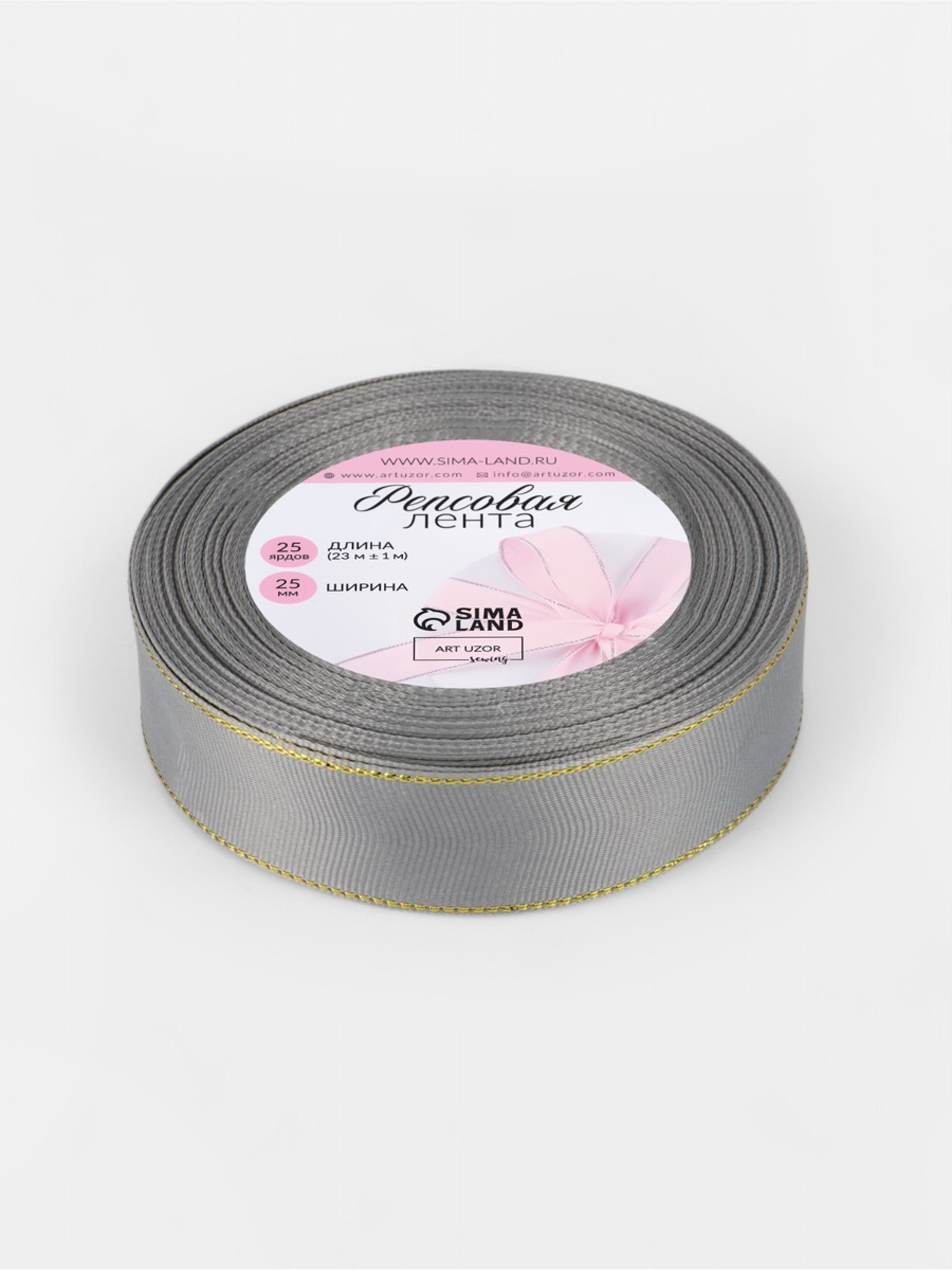 Лента репсовая, с золотым люрексом, 25 мм, 23+-1 м, светло-серая №003, 9x9x2.5 см., Арт Узор, Китай