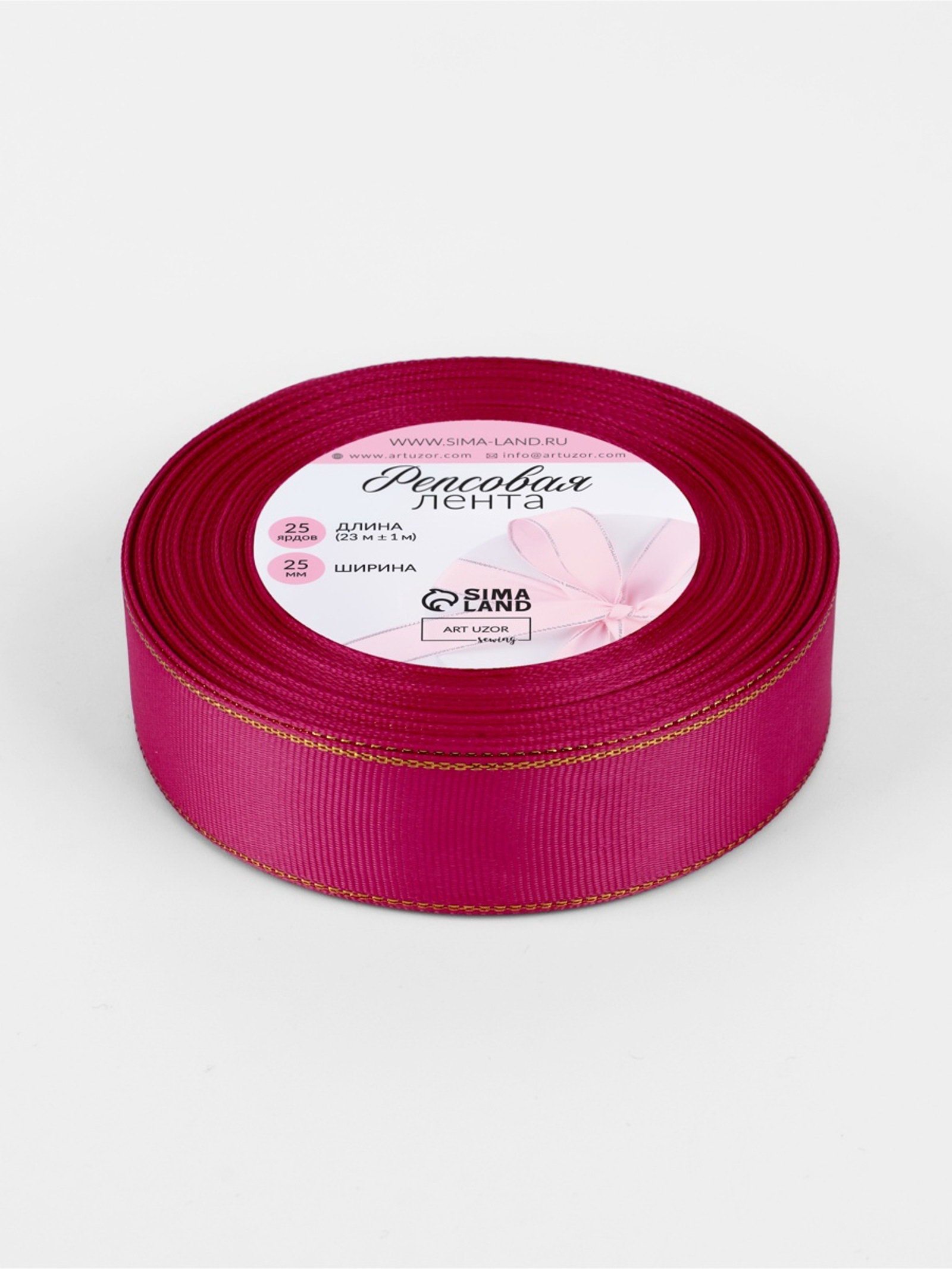 Лента репсовая, с золотым люрексом, 25 мм, 23+-1 м, ярко-розовая №028, 9x9x2.5 см., Арт Узор, Китай