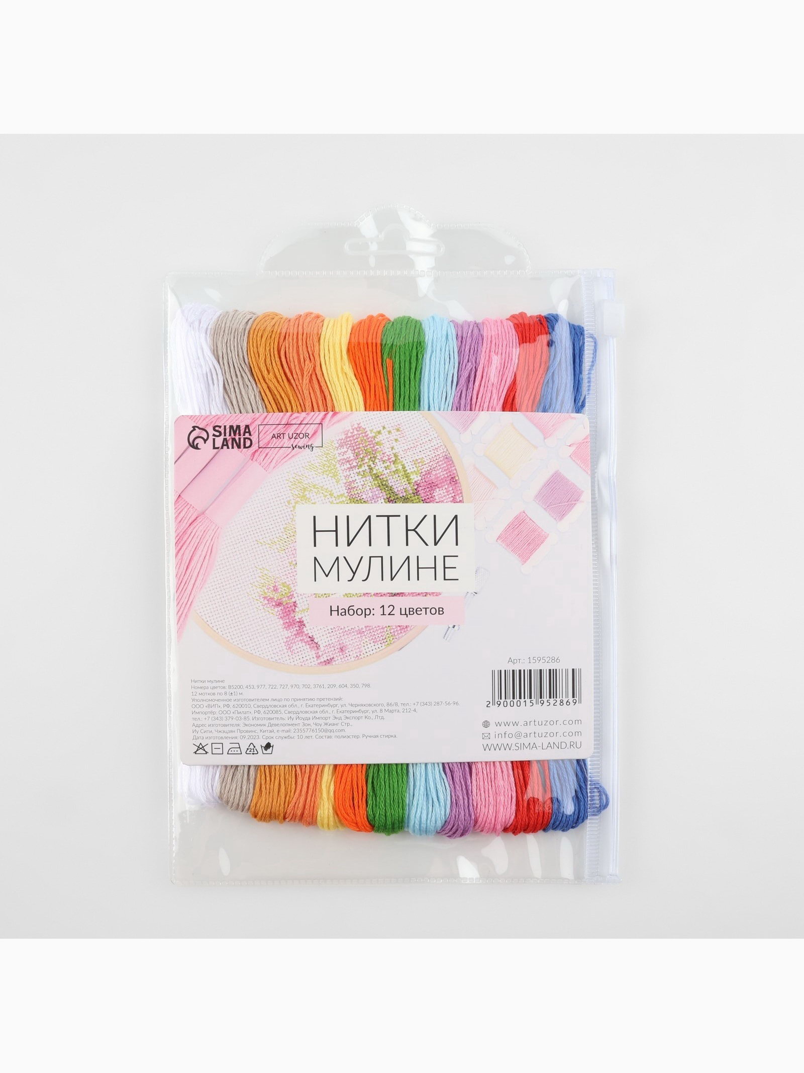 Нитки мулине №1, 8+-1 м, набор 12 шт., разноцветные, 14x21x1.5 см., Арт Узор, Китай