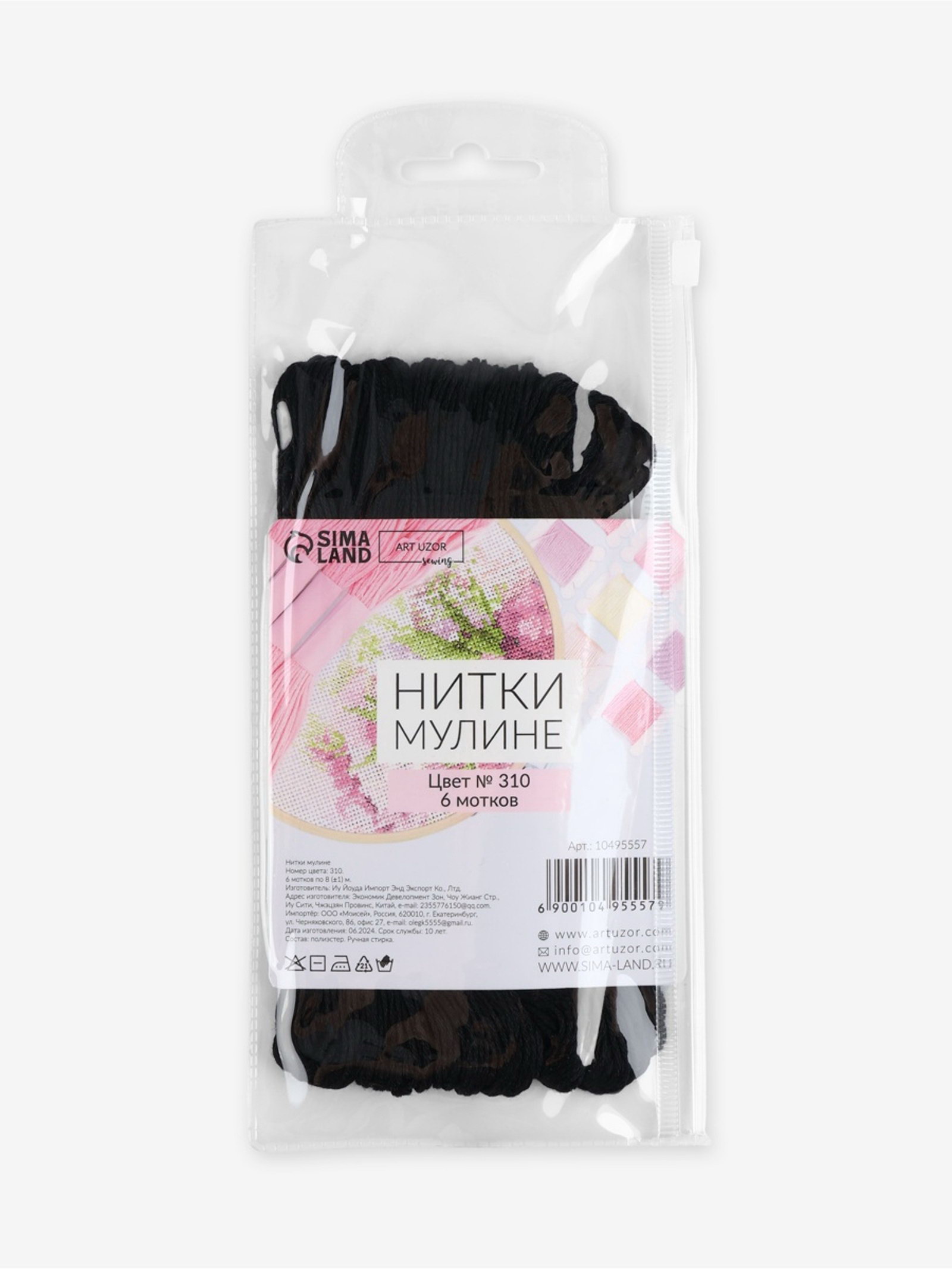Набор ниток мулине №310, 8+-1 м, 6 шт., чёрный, 10x22x1.5 см., Арт Узор, Китай