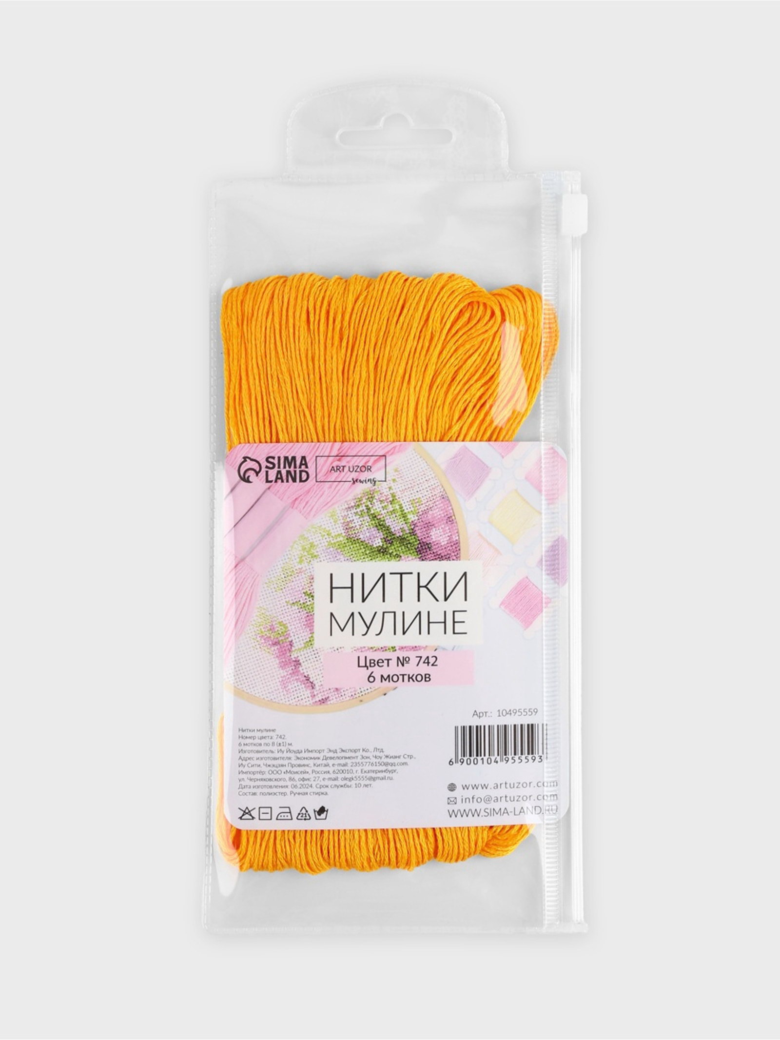 Набор ниток мулине №742, 8+-1 м, 6 шт., светло-оранжевый, 10x22x1.5 см., Арт Узор, Китай