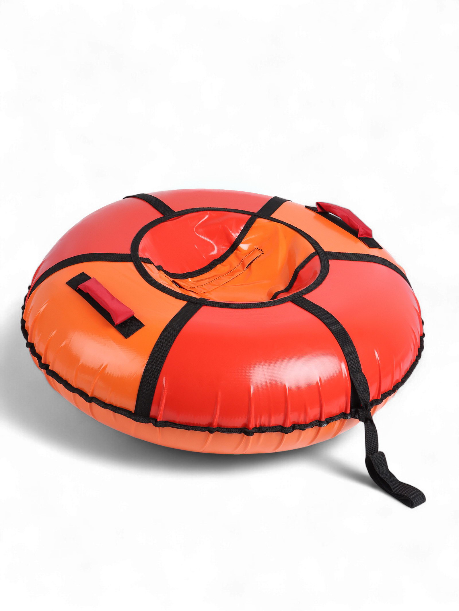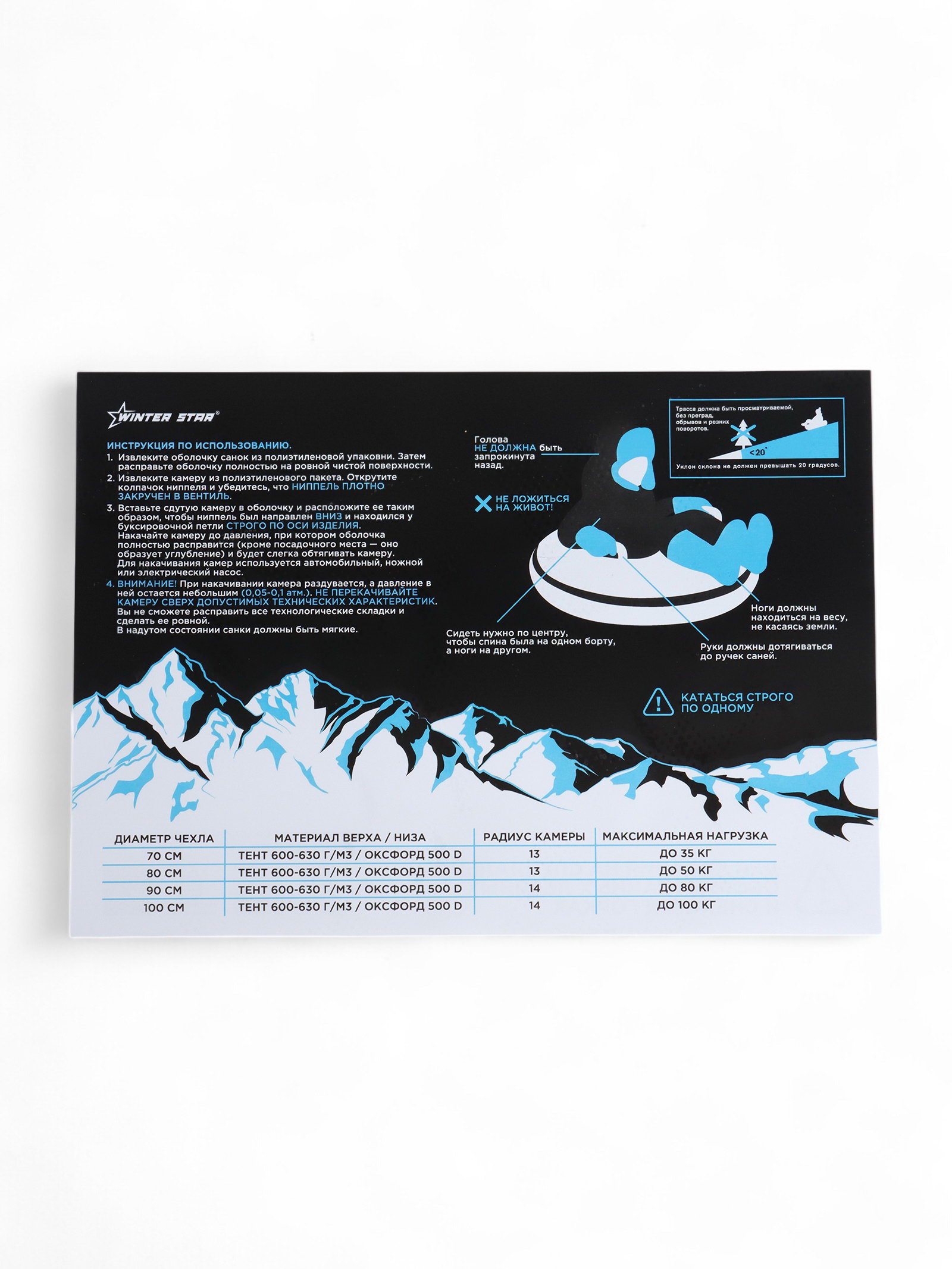 Дно тюбинга изготовлено из тентовой ткани плотностью 550-650 г/?2, что гарантирует долгий срок службы и обеспечивает отличное скольжение. Снаряд оснащён безопасными ручками и молнией для быстрого доступа к камере. Имеет закрытую сердцевину, что исключает попадание снега внутрь. Для тюбинга подойдёт камера 14 дюймов. Предназначен для детей от 12 лет. Особенности
