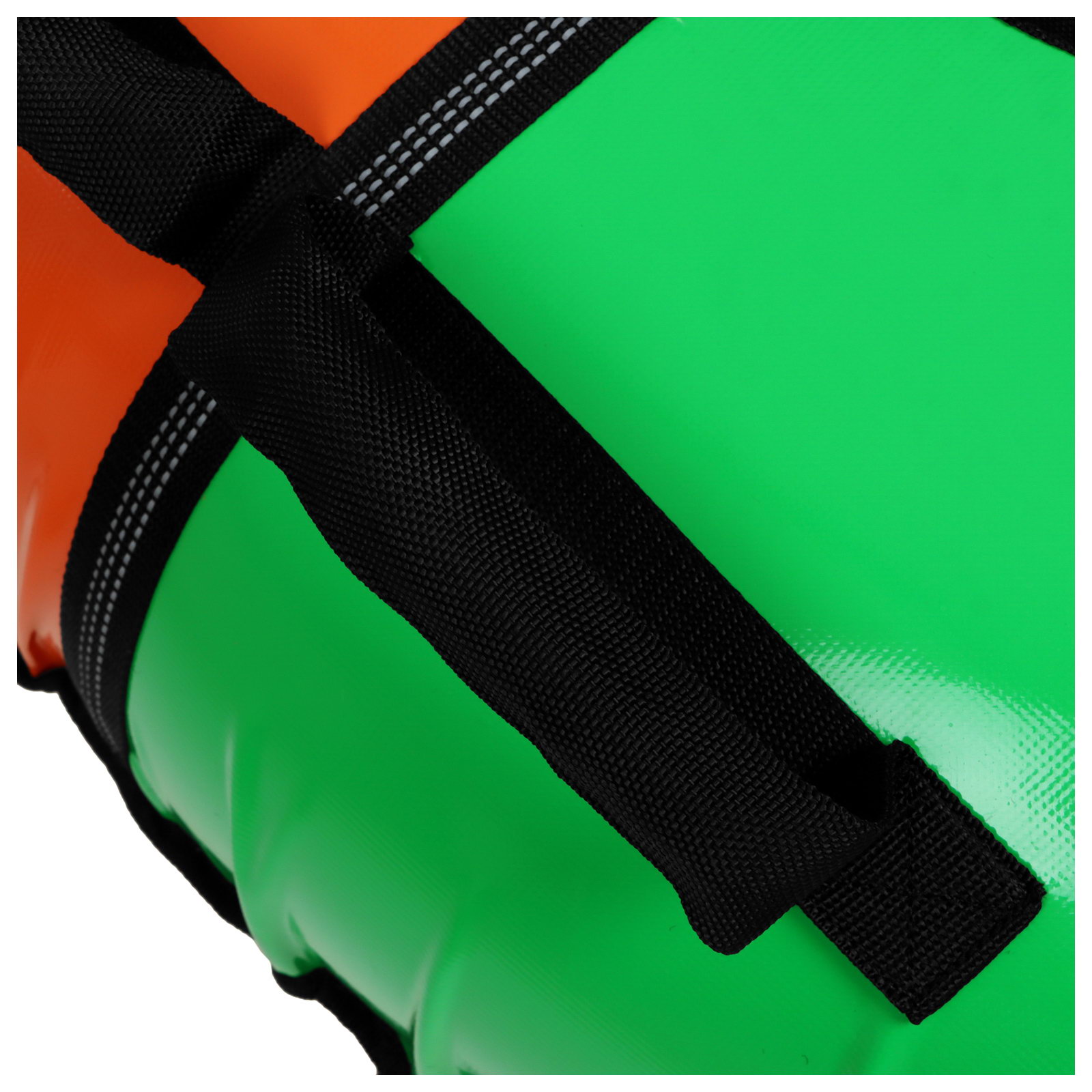 Дно тюбинга изготовлено из тентовой ткани плотностью 550-650 г/?2, что гарантирует долгий срок службы и обеспечивает отличное скольжение. Снаряд оснащён безопасными ручками и молнией для быстрого доступа к камере. Имеет закрытую сердцевину, что исключает попадание снега внутрь. Для тюбинга подойдёт камера 16 дюймов. Предназначен для детей от 12 лет. Особенности