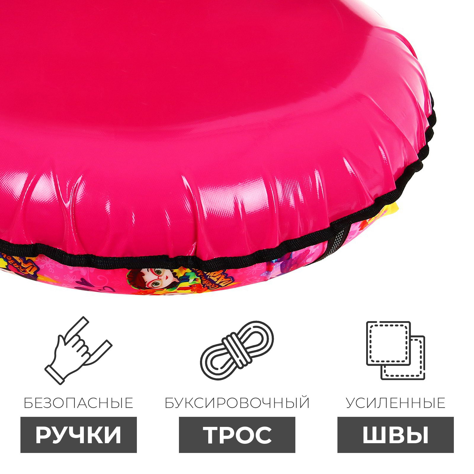 Размер упаковки: 33 x 12 x 33 см. Лицензия разработки: Да tnved: 9506999000 tnved: 9506999000 Температурное ограничение: Нет Вместимость, чел.: 1 Диаметр тюбинга в накачанном виде, см (±5 см): 80 Камера в комплекте: Да Ручки: Да Диаметр чехла, см: 85 Подсветка: Нет С тросом: Да Форма: Круг Тип: Камерный Материал (верх/низ): Оксфорд/тент Maксимальная нагрузка, кг: 80 Цвет: Розовый Расцветка: С принтом Дно тюбинга изготовлено из автотента ПВХ 610, что гарантирует долгий срок службы и обеспечивает отличное скольжение. Тюбинг оснащён безопасными эргономичными ручками и молнией для быстрого доступа к камере. Снаряд имеет закрытую сердцевину, что исключает попадание снега внутрь. Фактический размер накачанного тюбинга зависит от температуры внешней среды и давления в камере. Характеристики