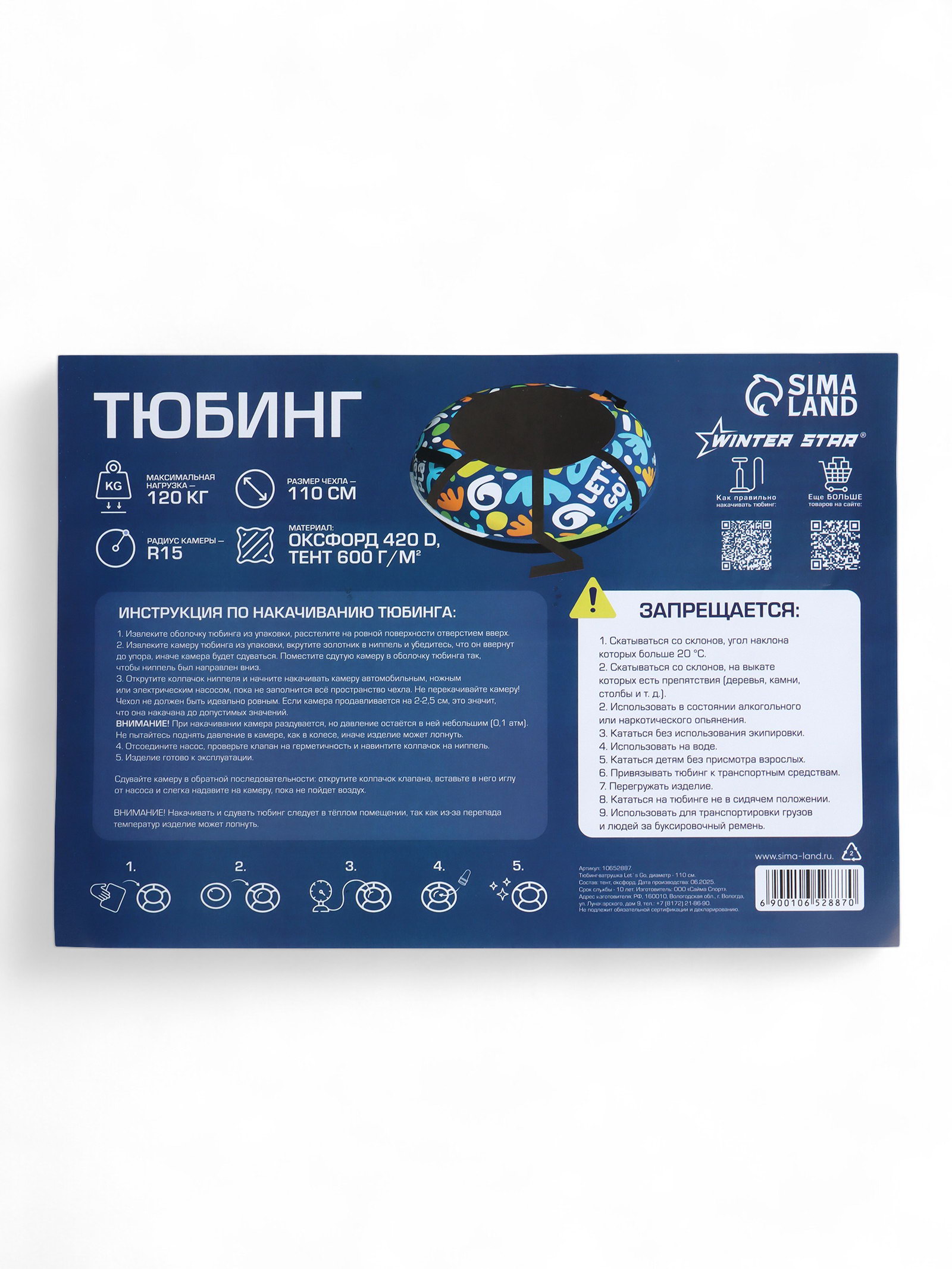 Цвет: Синий, Чёрный Размер упаковки: 35 x 8 x 30.5 см. Температурное ограничение: Нет Камера в комплекте: Да Maксимальная нагрузка, кг: 120 С тросом: Да Диаметр чехла, см: 110 Подсветка: Нет Диаметр тюбинга в накачанном виде, см (±5 см): 100 Вместимость, чел.: 1 Ручки: Да Подходящий размер камеры: R15 Тип: Камерный Форма: Круг Материал (верх/низ): Оксфорд/тент Расцветка: С принтом tnved: 9506999000 Возраст: От 12 лет Дно тюбинга изготовлено из тентовой ткани плотностью 600 г/?2, что гарантирует долгий срок службы и обеспечивает отличное скольжение. Снаряд оснащён безопасными ручками. Для тюбинга подойдёт камера 15 дюймов. Предназначен для детей от 12 лет. Особенности