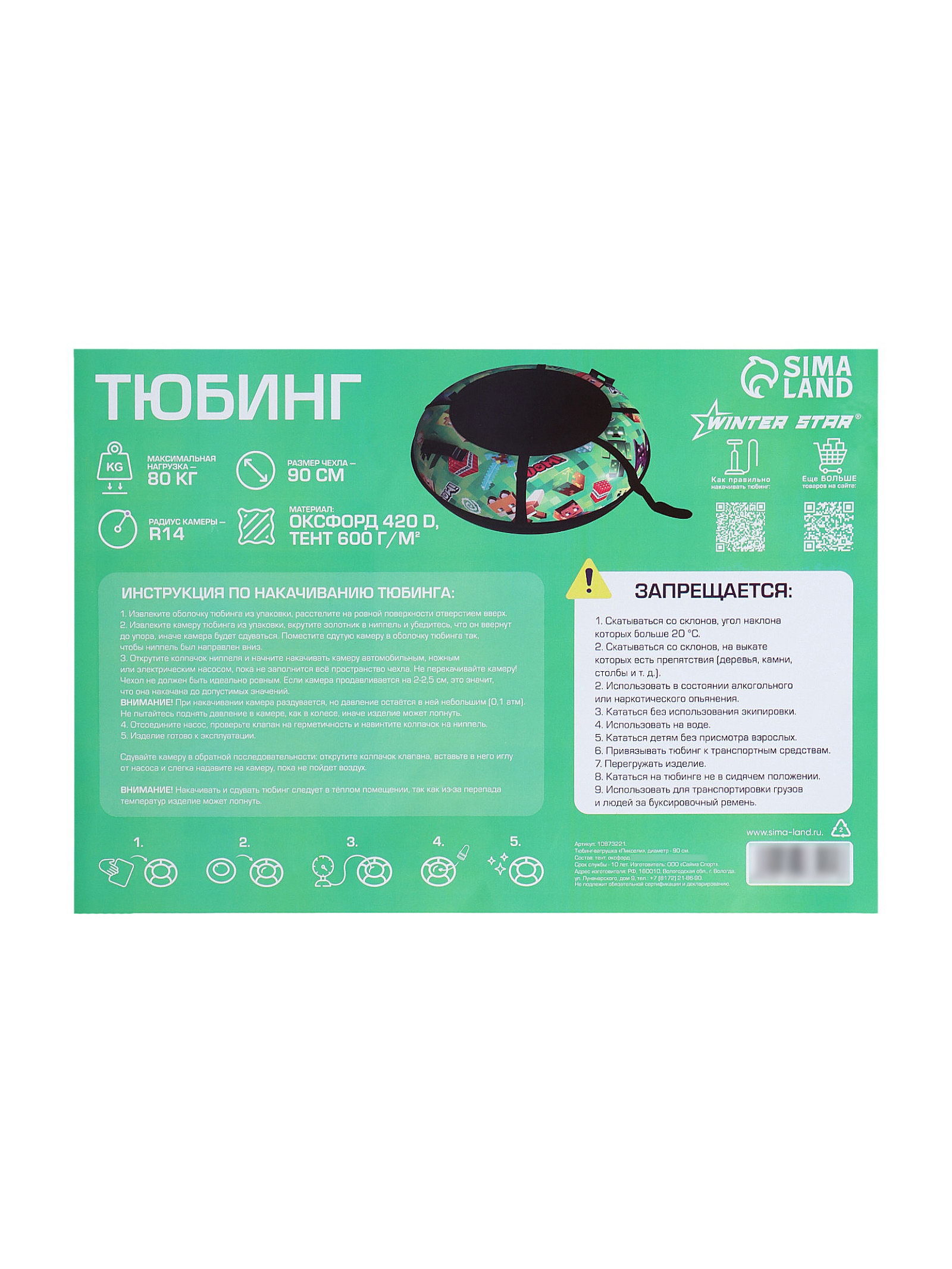 Размер упаковки: 25 x 5 x 32 см. tnved: 9506999000 Камера в комплекте: Да Подсветка: Нет Вместимость, чел.: 1 Ручки: Да Расцветка: С принтом С тросом: Да Диаметр чехла, см: 90 Температурное ограничение: Нет Диаметр тюбинга в накачанном виде, см (±5 см): 75 Возраст: От 3 лет Тип: Камерный Форма: Круг Подходящий размер камеры: R14 Материал (верх/низ): Оксфорд/тент Максимальная нагрузка, кг: 80 Цвет: Зелёный Окунитесь в атмосферу весёлых зимних развлечений с тюбингом – ватрушкой "Пиксели" Winter Star. Яркий дизайн с персонажами из игры привлечёт внимание и поднимет настроение каждому ребёнку. Компактный диаметр чехла 90 см делает его идеальным выбором для детей от 3 лет, а продуманная конструкция обеспечивает комфорт и безопасность при катании. Преимущества конструкции