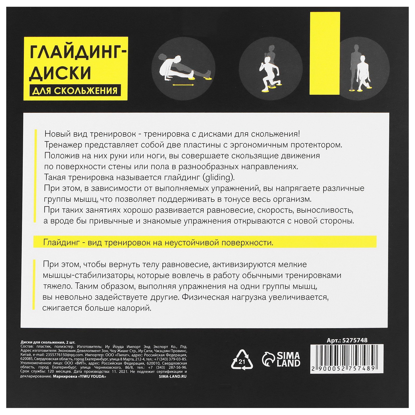 Вид: Диски для скольжения, Диски для скольжения Размер упаковки: 18 x 2 x 18 см. Вид спорта: Фитнес tnved: 9506919000 Цвет: Чёрный Набор: Да Тренажёр представляет собой 2 пластины с эргономичным протектором. Небольшие плоские диски предназначены для скольжения по полу руками или ногами. Такая техника тренировок называется глайдингом. В ходе упражнений руки и ноги не отрываются от пола, а выполняют скользящие движения в разных направлениях, поддерживая вес тела. Тренировки с дисками для глайдинга развивают равновесие, скорость, выносливость. | ||
