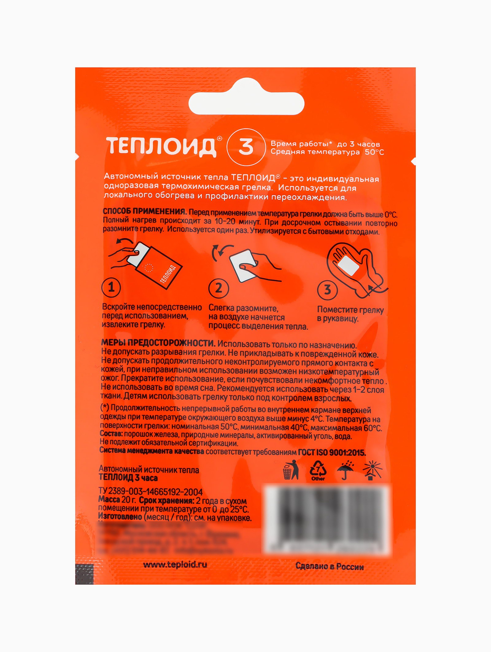 Размер упаковки: 8.5 x 0.5 x 13.5 см. Размер упаковки: 8.5 x 0.5 x 13.5 см. tnved: 3824999400 Температурное ограничение: Нет Область применения: Универсальный Автономный источник тепла "Теплоид" - это одноразовая грелка, которая не нуждается в электричестве или топливе, генерируя тепло автономно. Обычно его размещают во внутренних карманах одежды, в рукавицах, обуви. Теплоид представляет собой небольшой пакетик из нетканного полимерного воздухопроницаемого материала. Пакетик наполнен тепловыделяющей смесью, состоящей из натуральных компонентов: порошок железа, вода, активированный уголь, природные минералы. Тепло выделяется в результате ускоренного окисления кислородом железа, когда пакетик, будучи извлечен из упаковки, окажется на воздухе. Время работы варьируется от 3 до 10 часов (см. на упаковке). Средняя температура нагревания составляет минимум 50° С, максимум 60° С. Инструкция по применению: Вскрыть пакет непосредственно перед использованием. Извлечь и слегка встряхнуть грелку, на воздухе грелка станет тёплой. Положить грелку во внутренний карман одежды (полный нагрев происходит за 10-20 минут). При остывании раньше срока повторно встряхнуть грелку. Используется один раз. Утилизируется с бытовыми отходами. Предостережения: Не вскрывать наружный пакет до применения по назначению. Не использовать во время сна. При непосредственном контакте с кожей в течение длительного времени возможен низкотемпературный ожог. Рекомендуется использовать через 1-2 слоя ткани. Не допускать разрывания грелки. Детям до 3-х лет использовать грелку только под контролем взрослых. Состав: порошок железа, вода, активированный уголь, природные минералы | ||