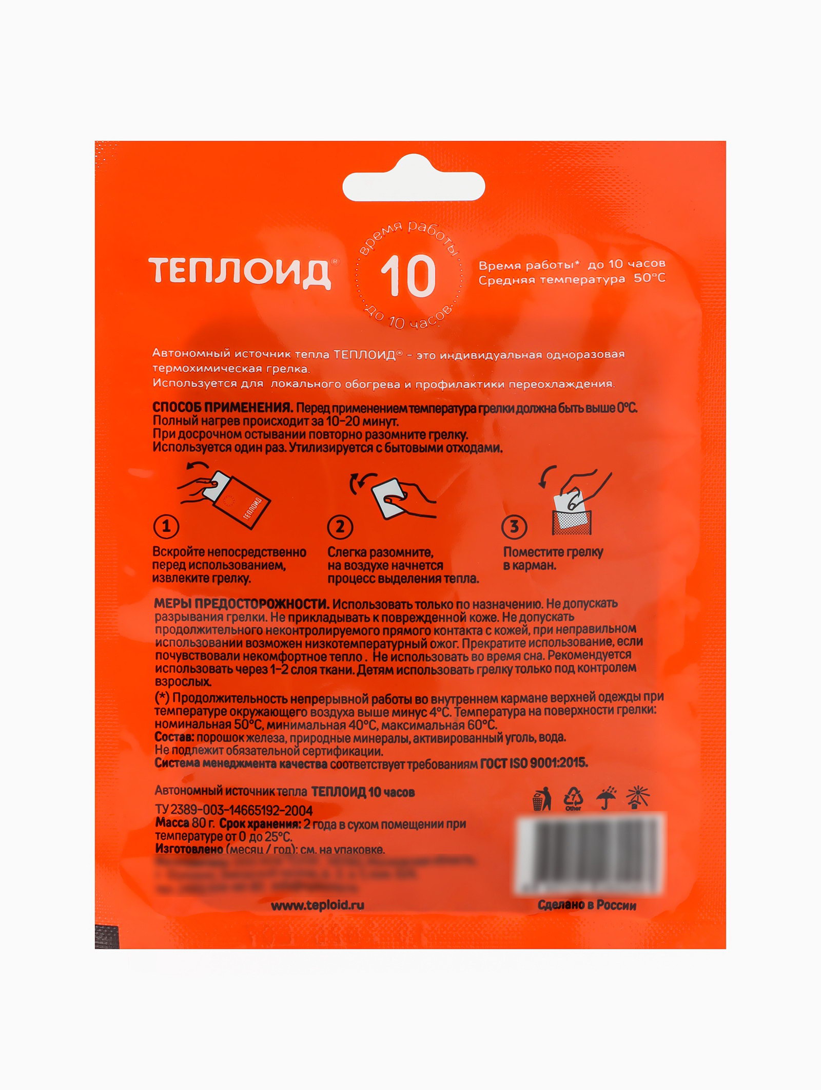 Размер упаковки: 13.5 x 0.5 x 18 см. tnved: 3824999400 Температурное ограничение: Нет Область применения: Универсальный Автономный источник тепла "Теплоид" - это одноразовая грелка, которая не нуждается в электричестве или топливе, генерируя тепло автономно. Обычно его размещают во внутренних карманах одежды, в рукавицах, обуви. Теплоид представляет собой небольшой пакетик из нетканного полимерного воздухопроницаемого материала. Пакетик наполнен тепловыделяющей смесью, состоящей из натуральных компонентов: порошок железа, вода, активированный уголь, природные минералы. Тепло выделяется в результате ускоренного окисления кислородом железа, когда пакетик, будучи извлечен из упаковки, окажется на воздухе. Время работы варьируется от 3 до 10 часов (см. на упаковке). Средняя температура нагревания составляет минимум 50° С, максимум 60° С. Инструкция по применению: Вскрыть пакет непосредственно перед использованием. Извлечь и слегка встряхнуть грелку, на воздухе грелка станет тёплой. Положить грелку во внутренний карман одежды (полный нагрев происходит за 10-20 минут). При остывании раньше срока повторно встряхнуть грелку. Используется один раз. Утилизируется с бытовыми отходами. Предостережения: Не вскрывать наружный пакет до применения по назначению. Не использовать во время сна. При непосредственном контакте с кожей в течение длительного времени возможен низкотемпературный ожог. Рекомендуется использовать через 1-2 слоя ткани. Не допускать разрывания грелки. Детям до 3-х лет использовать грелку только под контролем взрослых. Состав: порошок железа, вода, активированный уголь, природные минералы | ||