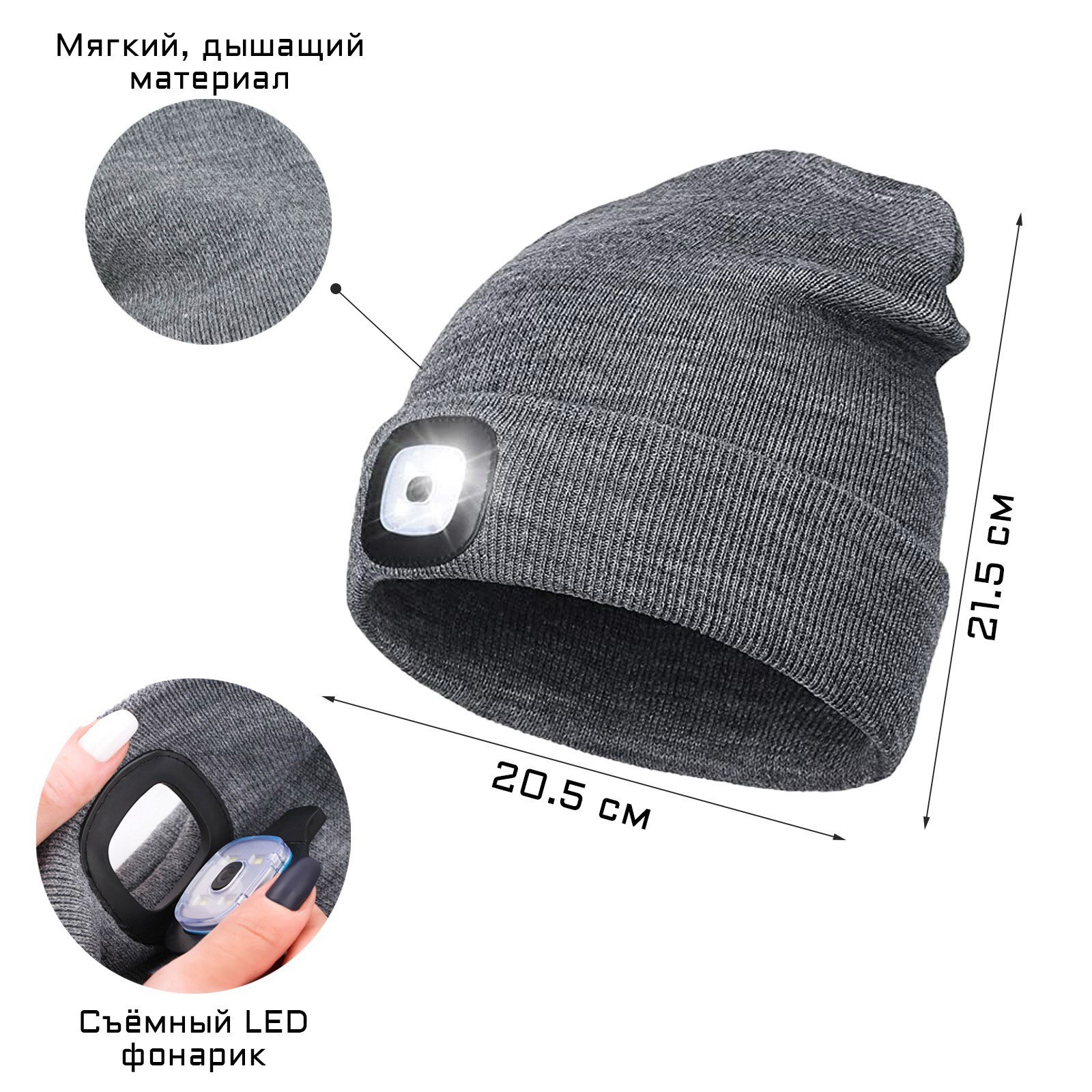 Размер упаковки: 20 x 3 x 21 см. tnved: 6505009000 Честный знак: Честный знак Влагозащита: Да Тип питания: От аккумулятора Способ зарядки аккумулятора: От USB Материал корпуса: Акрил Сезон: Демисезон Цвет: Серый Для кого: Унисекс Особенность: С фонарём Состав: Акрил Материал подкладки: Без подкладки Ткань: Акрил Теплая и комфортная шапочка со съемным LED фонариком предназначена для использования в условиях плохой видимости, подходит для активного отдыха. Невероятно удобный аксессуар, который позволит делать всё, что угодно в темноте, а также делает человека более заметным на улице, что необходимо при движении по автомобильной дороге или обочине. Особенности: