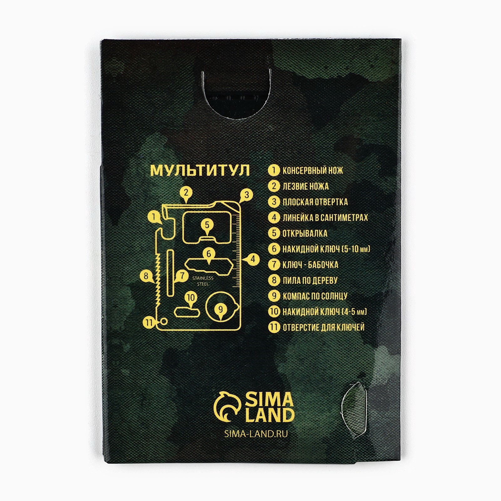 Размер упаковки: 0.4 x 9 x 6.3 см. Для кого: Для мужчины tnved: 8205510000 tnved: 8205510000 Количество функций: 11 Тематика праздника: 23 Февраля Наличие чехла: Да Функционал: - консервный нож; - лезвие ножа; - плоская отвертка; - линейка в сантиметрах; - открывалка; - накидной ключ (5-10 мм); - ключ-бабочка; - пила по дереву; - компас по солнцу; - накидной ключ (4-5 мм); - отверстие для ключей. Схема функционала представлена на обороте подарочной открытки. В комплекте идет специальный чехол для ножа, изготовленный из эко кожи. | ||