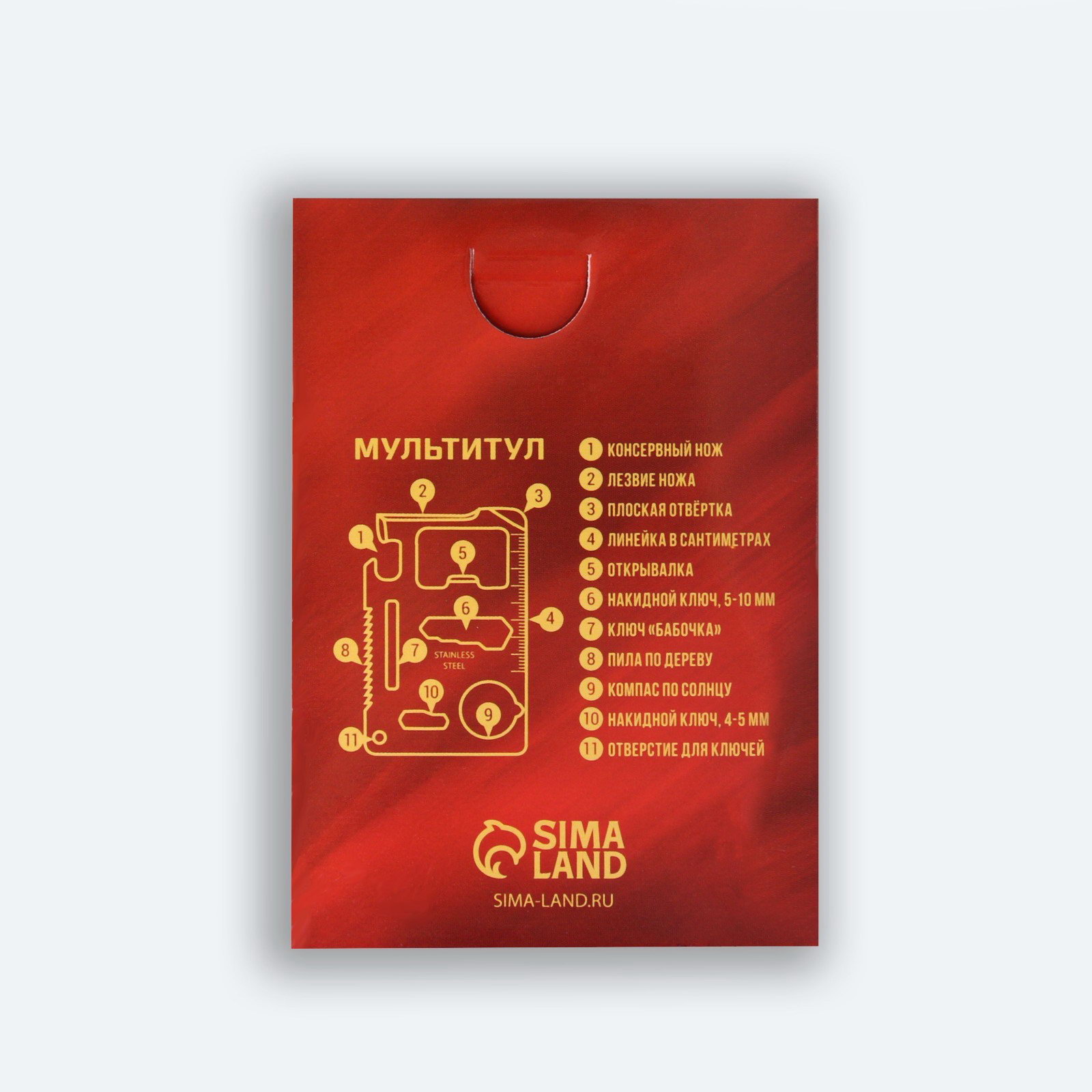 Размер упаковки: 0.4 x 9 x 6.3 см. Для кого: Для мужчины Адресат: Мужчине tnved: 8205510000 tnved: 8205510000 Наличие чехла: Да Количество функций: 11 Тематика праздника: 23 Февраля Функционал: - консервный нож; - лезвие ножа; - плоская отвертка; - линейка в сантиметрах; - открывалка; - накидной ключ (5-10 мм); - ключ-бабочка; - пила по дереву; - компас по солнцу; - накидной ключ (4-5 мм); - отверстие для ключей. Схема функционала представлена на обороте подарочной открытки. В комплекте идет специальный чехол для ножа, изготовленный из эко кожи. | ||