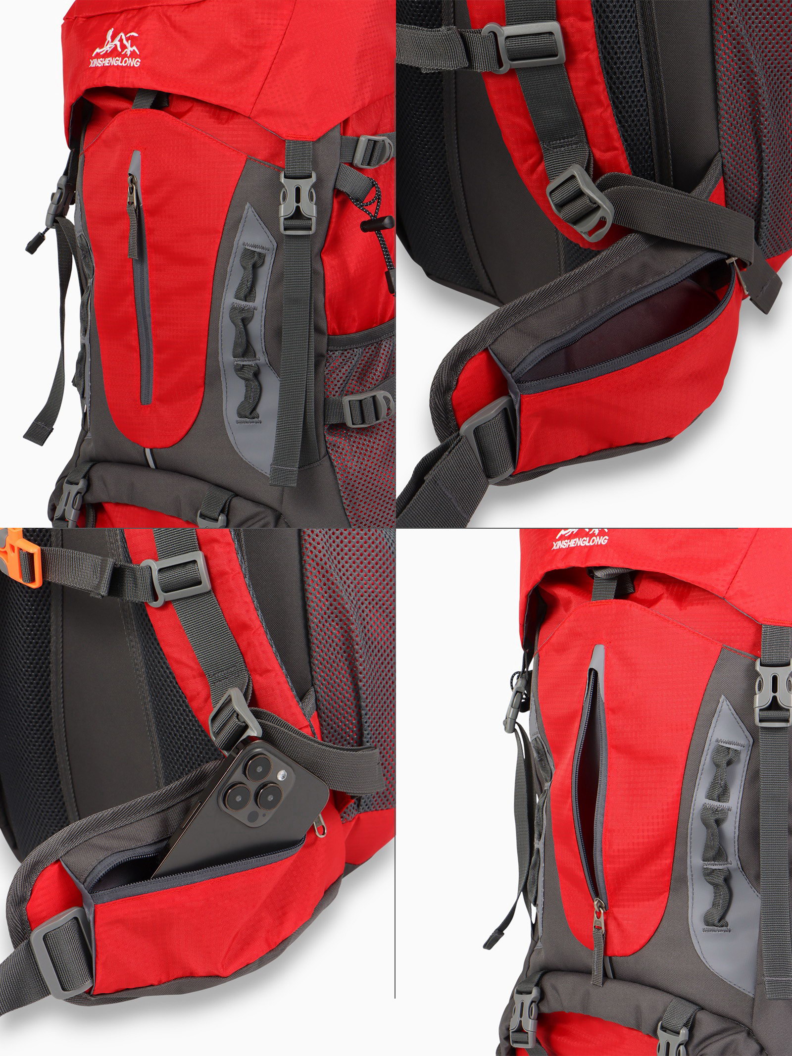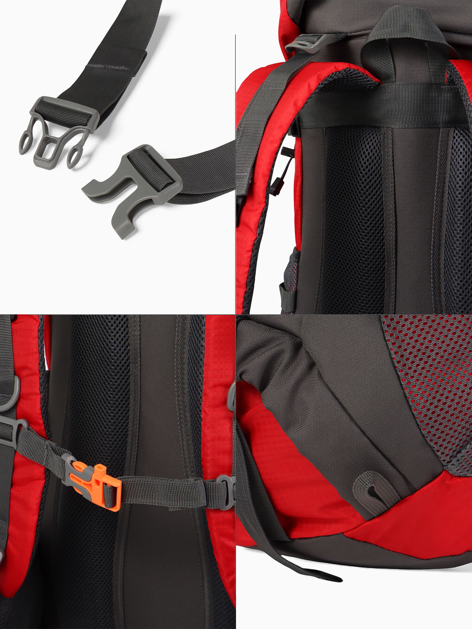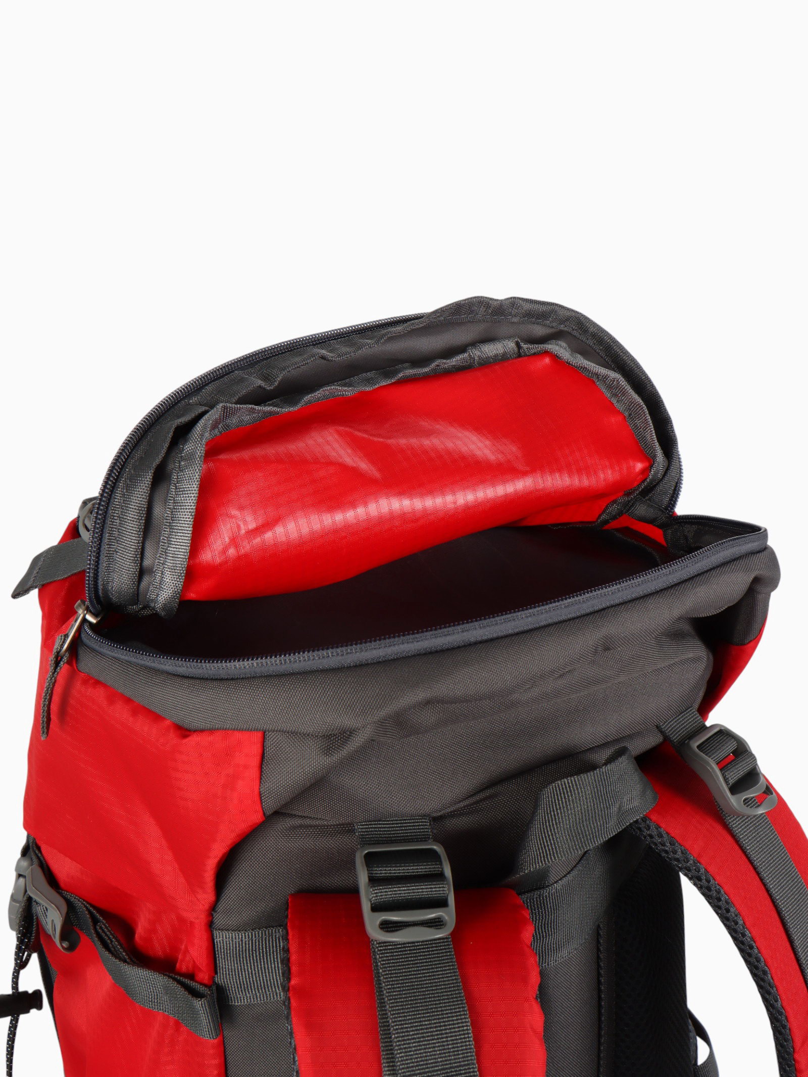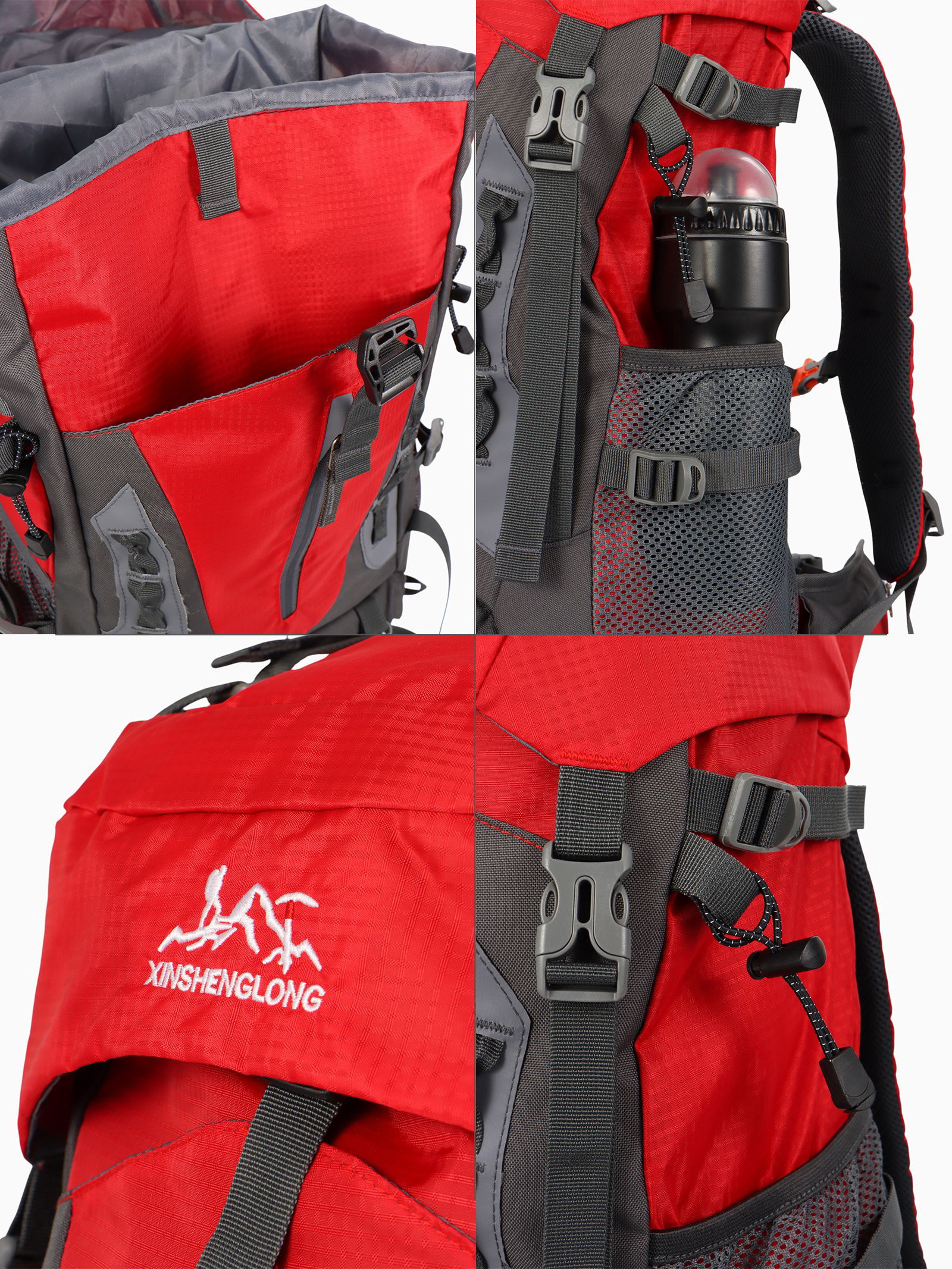 Рюкзак туристический, 65+5 литров, отдел на шнурке, 5 наружных карманов, 2 внутренних кармана, красный, 20x30x53 см., Китай