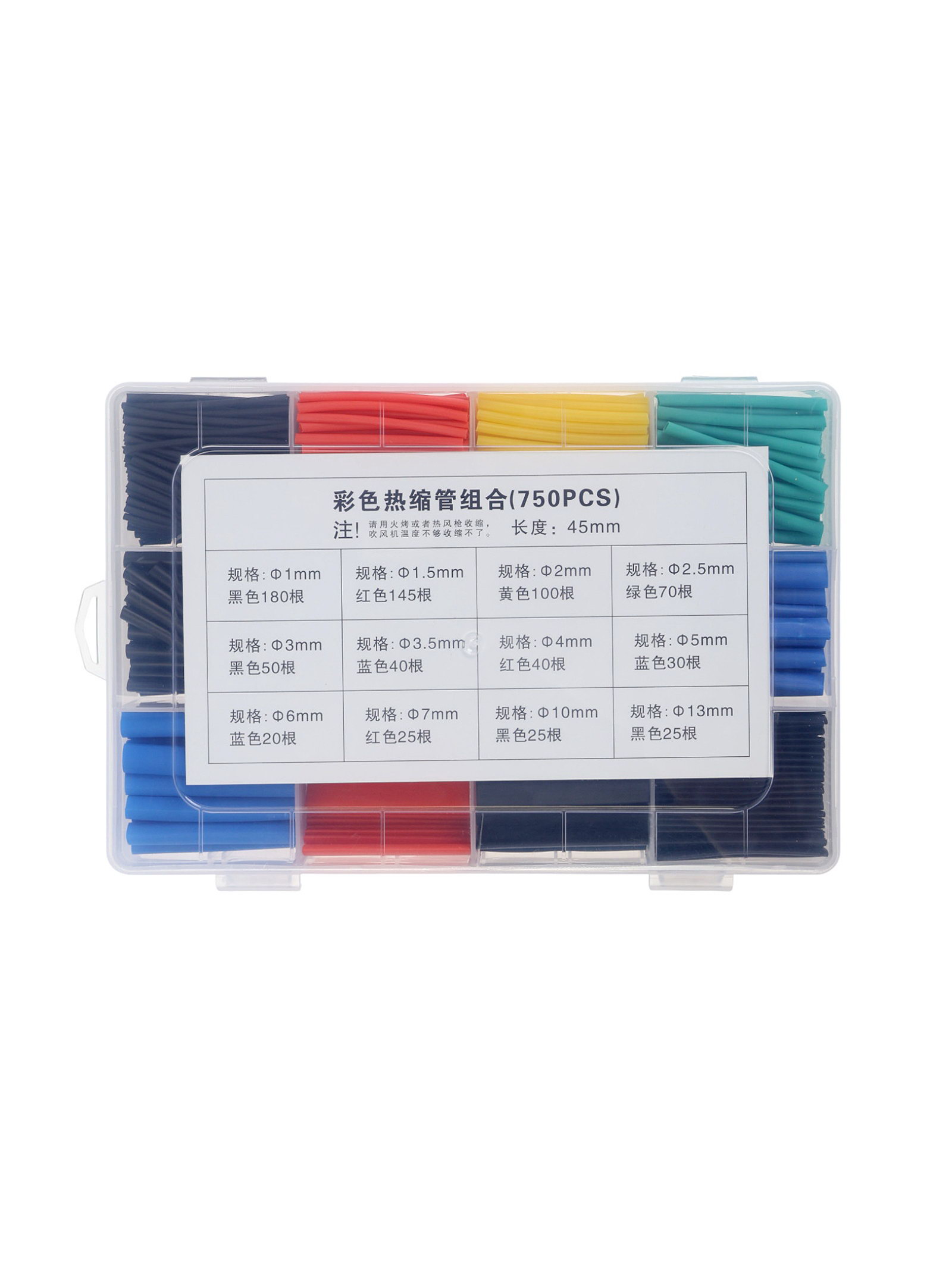 Термоусаживаемая трубка, 1/1.5/2/2.5/3/3.5/4/5/6/7/10/13 мм, набор 750 штук, длина 45 мм, в кейсе, 13.2x3.6x19.5 см., Luazon Lighting, Китай