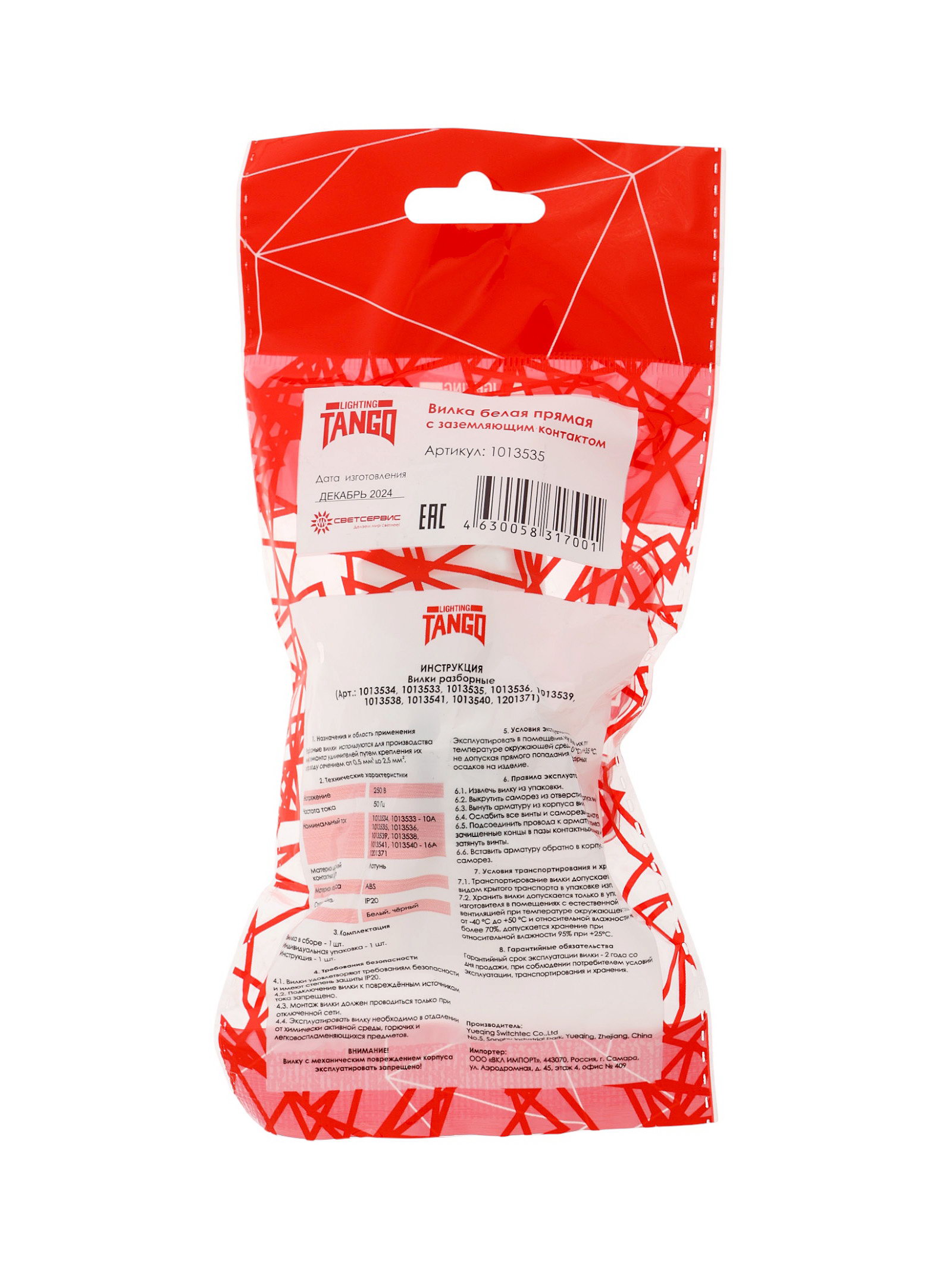 Вилка прямая 16 А, 250 В, IP20, с заземлением, белая, Tango, Китай