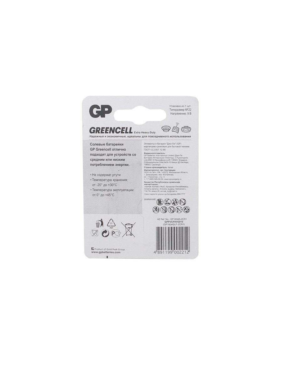 Батарейка солевая Greencell Extra Heavy Duty, 6F22-1BL, 9 В, крона, блистер, 1 шт., 2.5x5x1.5 см., GP, Китай