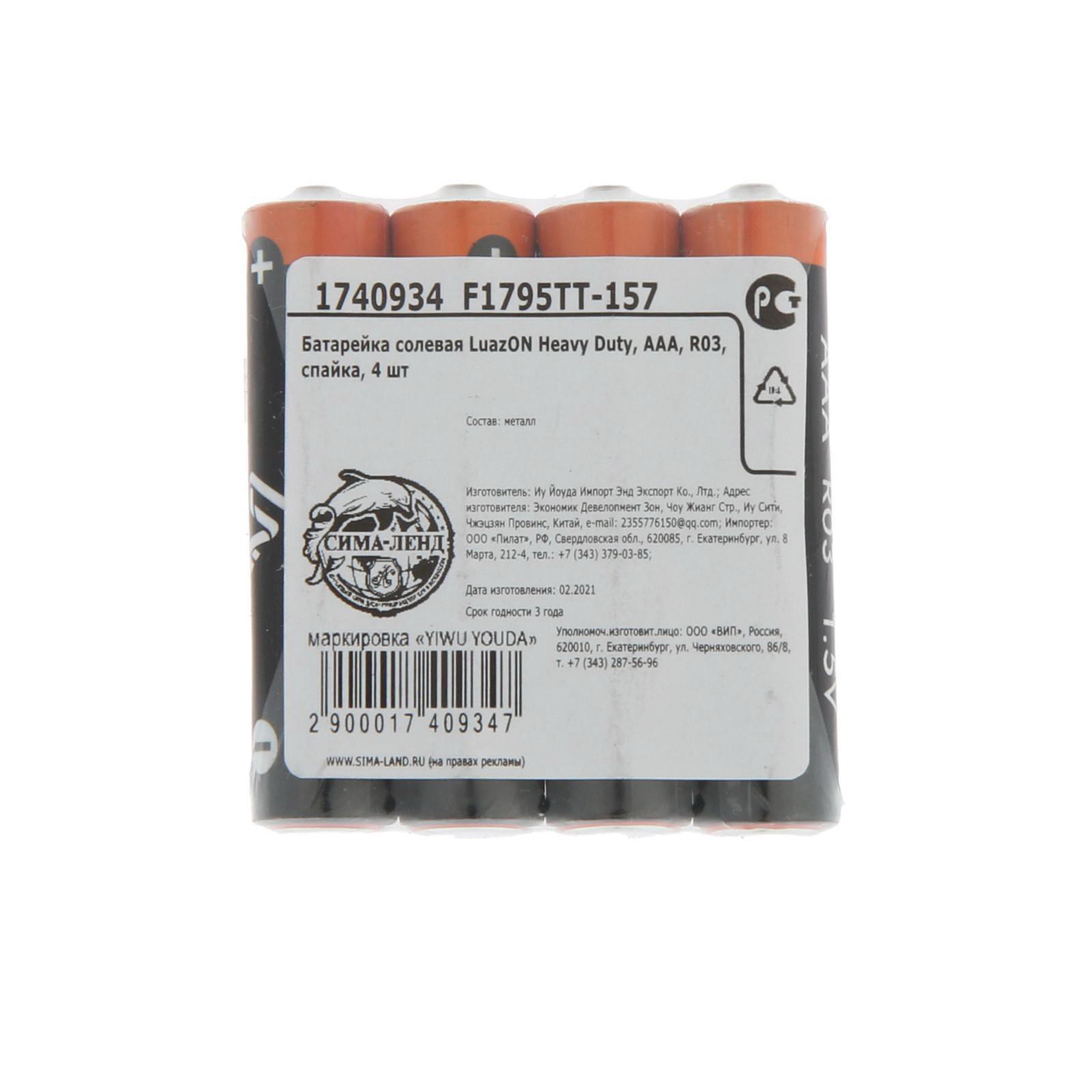 Батарейка солевая Luazon Heavy Duty, AAA, R03, спайка, 4 штуки, 1.4x1.4x5 см., Luazon Home, Китай